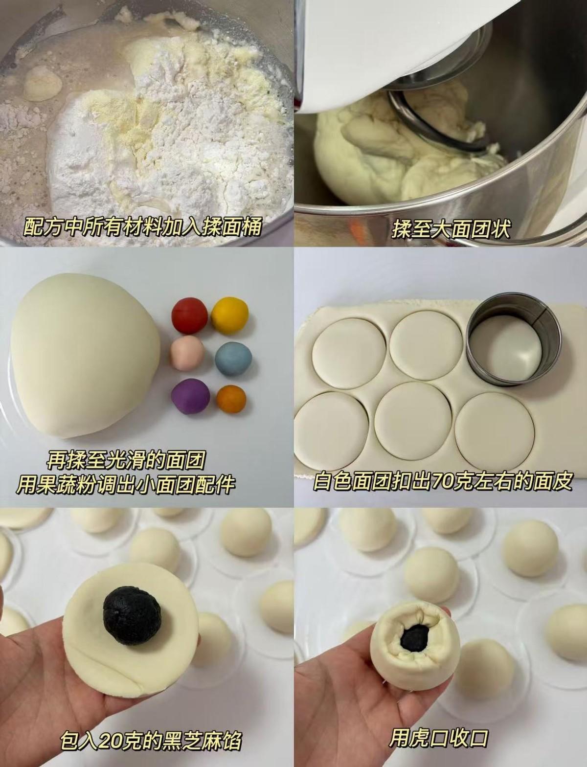 饅頭還是正常做,然後做點自己喜歡的麻餡料,剩下分出一些小麪糰用果蔬粉調色備用做配件。