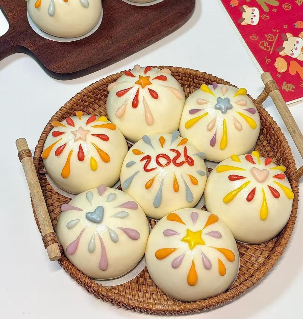 用模具壓制一些彩色愛心、桃心等放在饅頭頂上,以此爲圓心,粘上一些彩色“煙花”,還可以做些年份數字在上面。