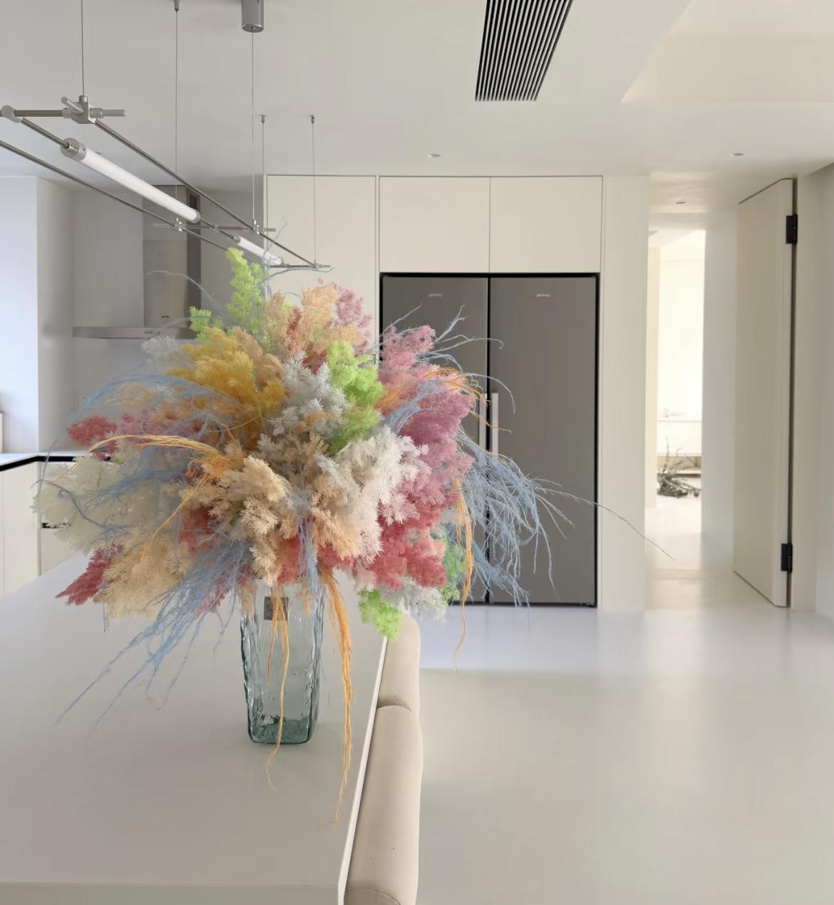 這束"白日焰火"插花做起來真的不難,材料主要有:針茅草、龍鬚草、蓬萊松和吊米等。