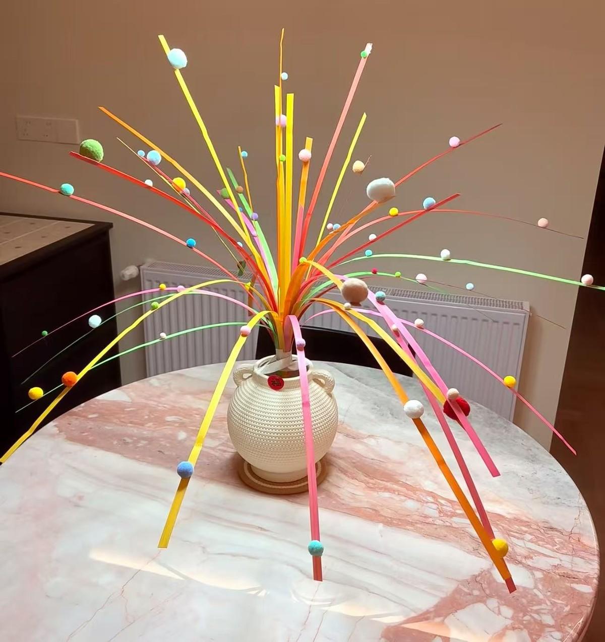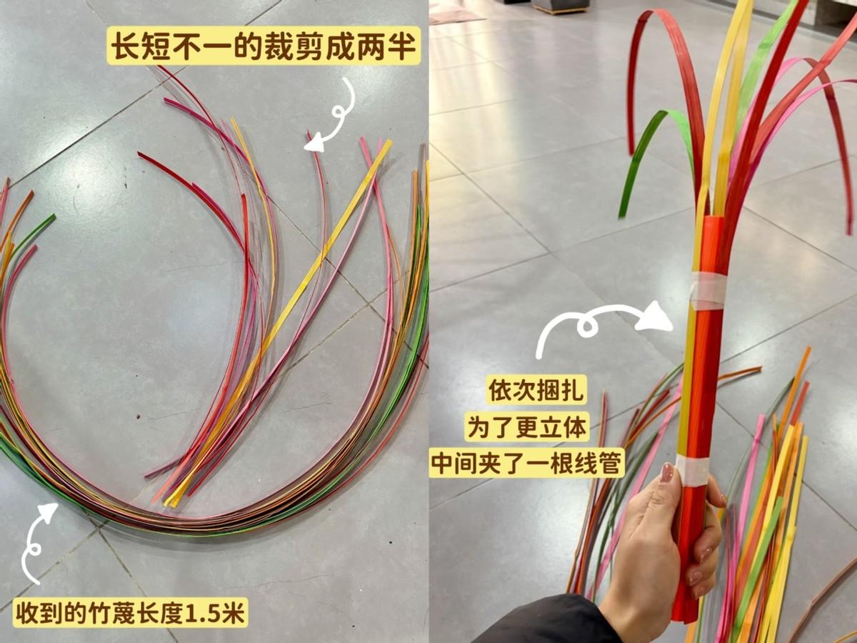 做法真的很簡單,就彩色竹篾剪成長短不一,再依次捆紮成放射狀就行。