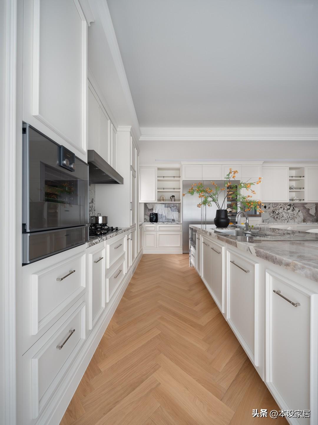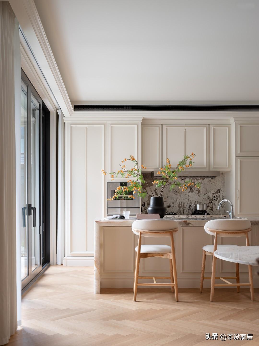 U型的中廚同樣選用米白色櫥櫃,整體風格配色純淨不失復古韻味,操作檯面的合理佈局,極致每一寸空間,而廚電採用嵌入式的設計,不僅提升廚房功能性,讓整體感也更強。