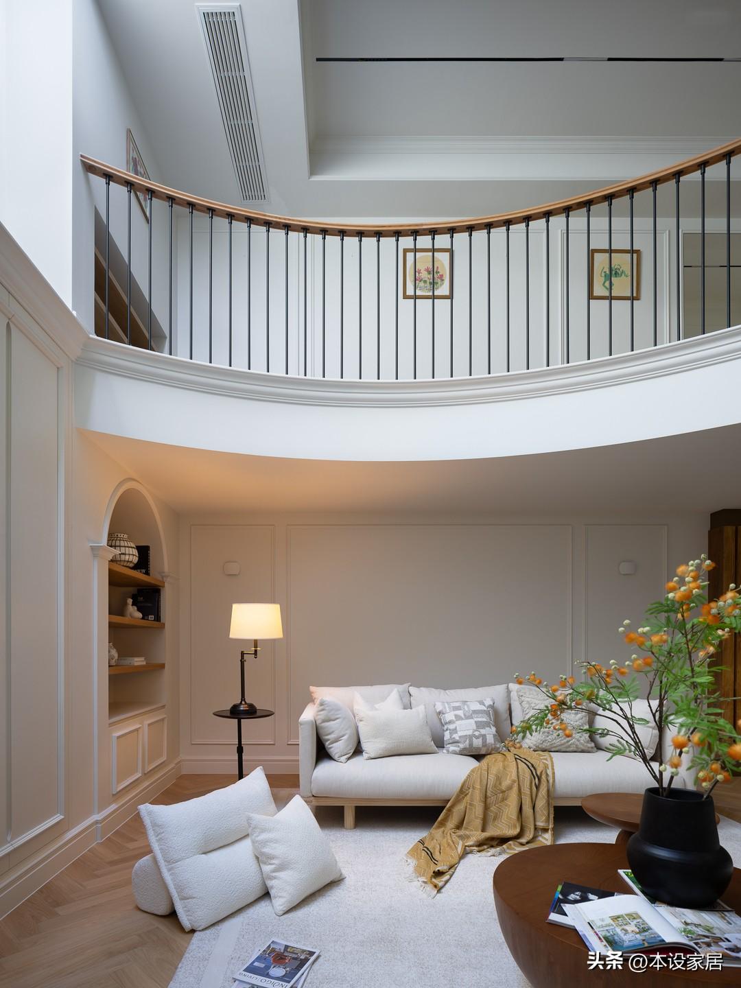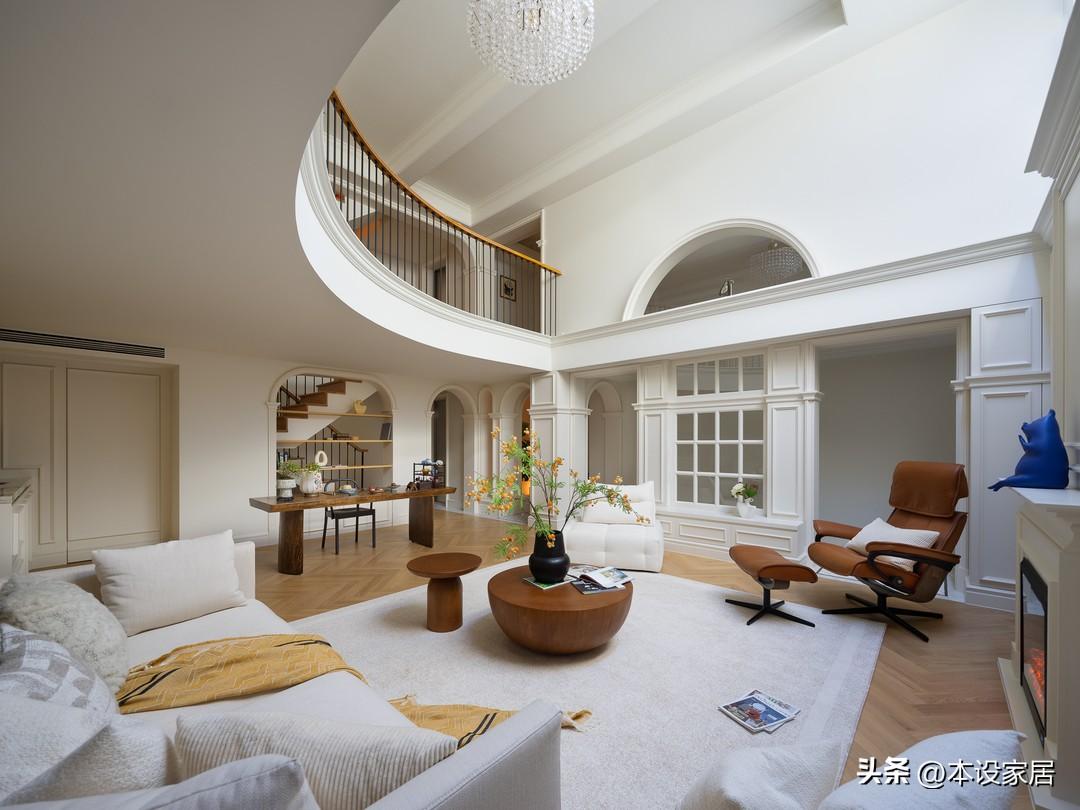 全屋採用偏法式的混搭風格,從客廳可以看出,平面佈局打破了法式的固有思維,並融合了當下的審美,對裝飾進行刪繁就簡,挑空圓弧天花的處理,讓視覺看起來更加柔和,從不同角度呈現出各異的感官體驗。