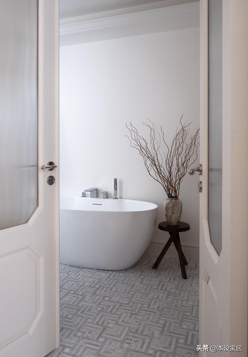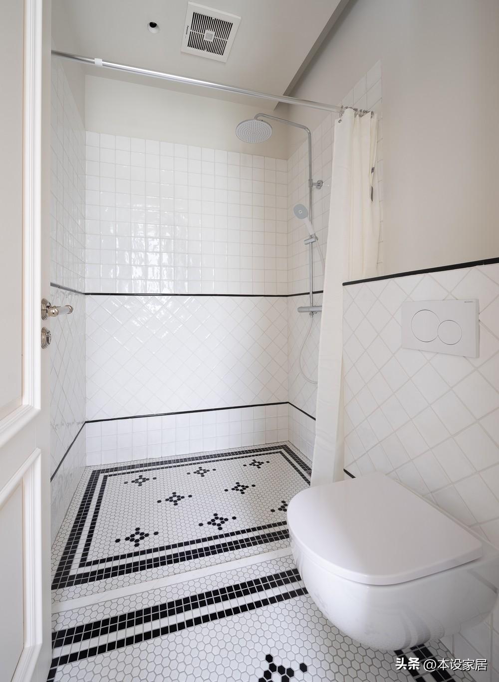 衛生間採用乾溼四分離,洗漱臺、馬桶、淋浴房和浴缸各自獨立,並以淺色爲主調,地面鋪設拼花小磚,搭配牆面斜貼米白色磚,簡單又不失氛圍感。