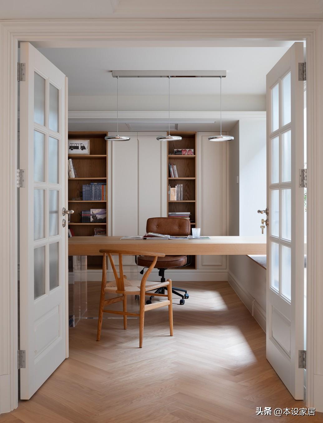 書房採光比較好,裝修很簡潔,看不到冗雜之形,僅一個長形原木大桌臺,能真實感受到實木的溫潤和溫暖的陽光,是生活在喧囂都市中一處令人沉靜的心靈棲所,也可以陪伴孩子讀書、辦公,共同度過美好的時光。