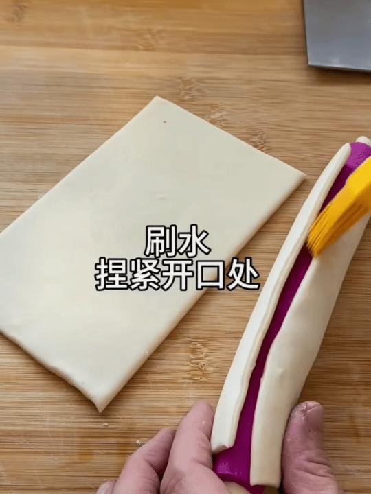 具體做法:先用火龍果汁和一塊粉面團,再和一塊白麪團;之後擀成面片,按照白、粉、白的順序卷三次,切面就是一個“口”字了;