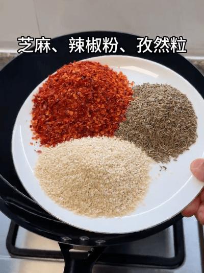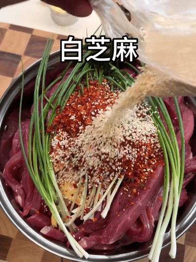 不怕洗鍋的,可以用鍋,撒芝麻、辣椒粉、孜然粉,和肉條炒拌均勻,如此更油亮噴香一些。