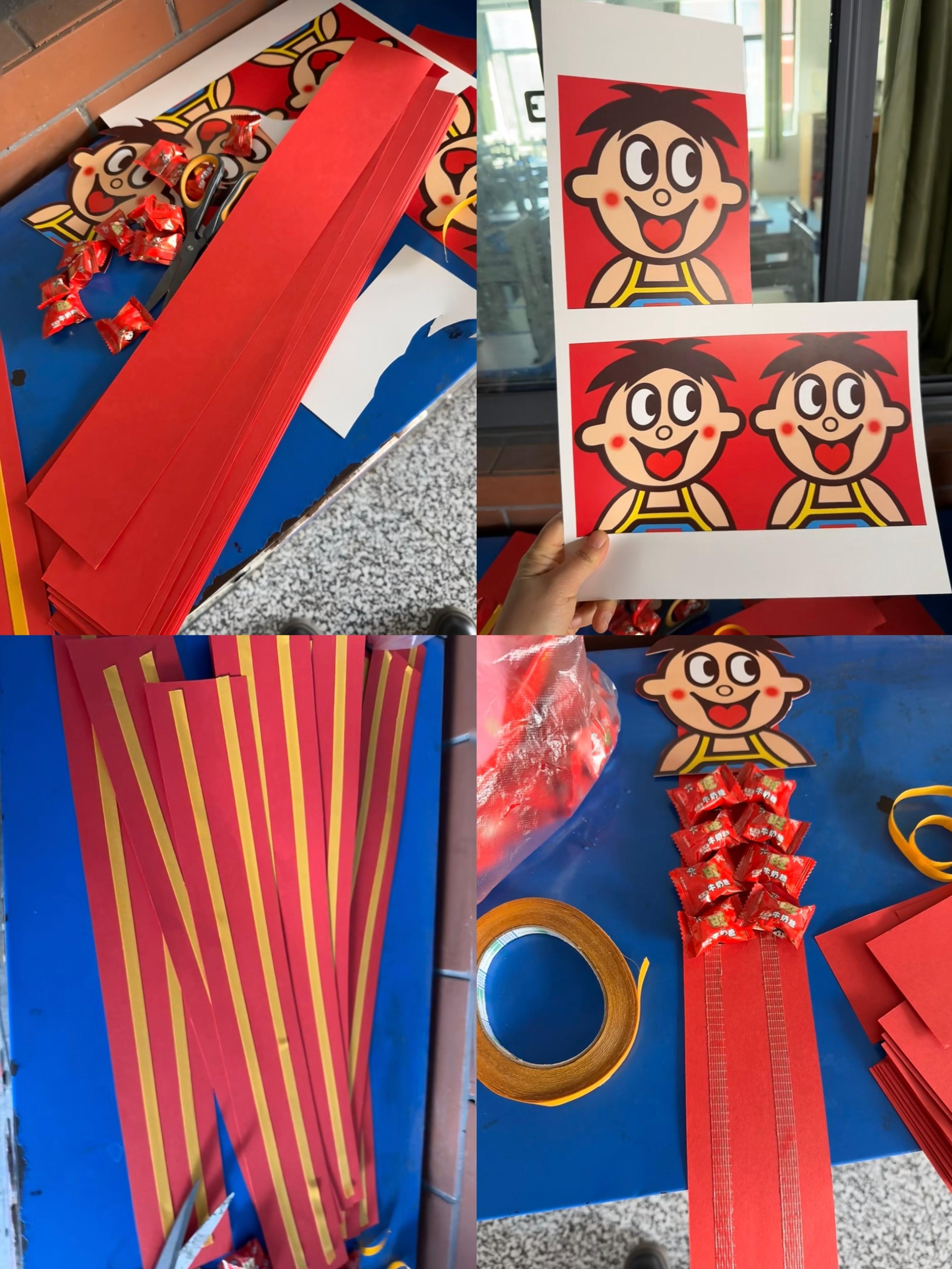 做起來也不難:先將旺仔頭像貼在長條卡紙頂端,沿着長條粘上糖,再將旺仔頭像打個孔,把中國結穿進去繫好,下半部分的穗,則用膠粘在長條底端,搞定。