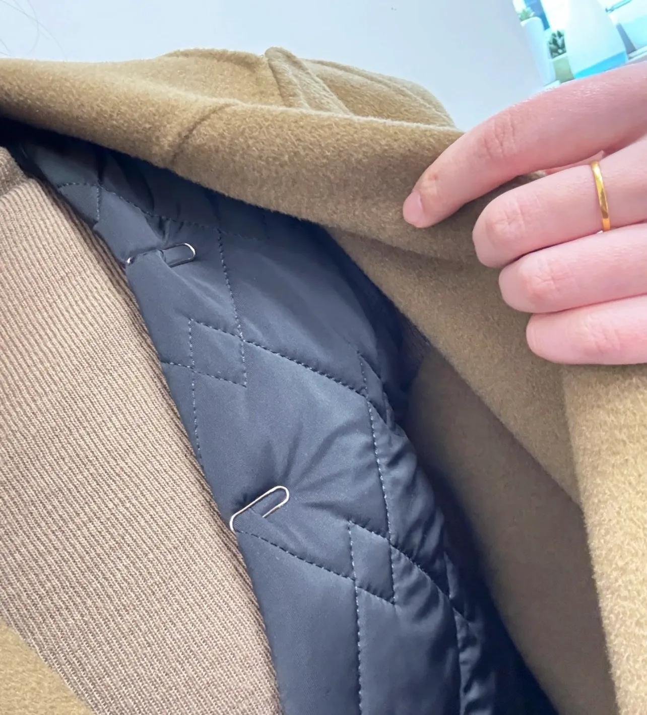 對於不太冷,能穿大衣的地區,中間層可以選擇羽絨馬甲。但如果是無扣的,領口部分露出來,顯得沒那麼好看,這時候,回形針就能悄悄解決問題。