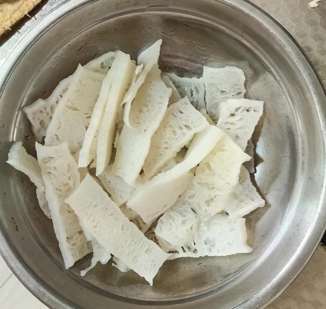 只有喫過的人,才明白爲啥它叫雪魔芋了,它看起來像一塊白色的凍豆腐,多孔蓬鬆。
