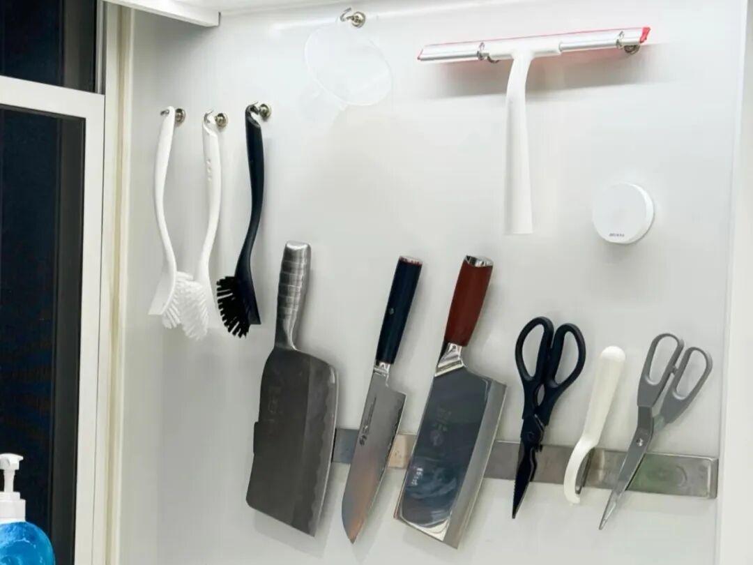 有了這個磁吸牆面,你會發現,像家裏廚房的刀具,調料瓶、文具等小物品的收納都是一目瞭然了。