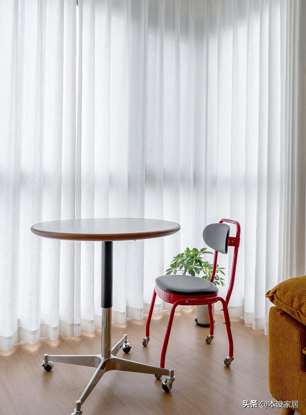 小小的陽臺佈置成休閒區,帶滾輪的圓桌和單椅,方便移動,當陽光穿過白色紗簾,濾出柔和的光線,讓不同色彩融合的很高級。