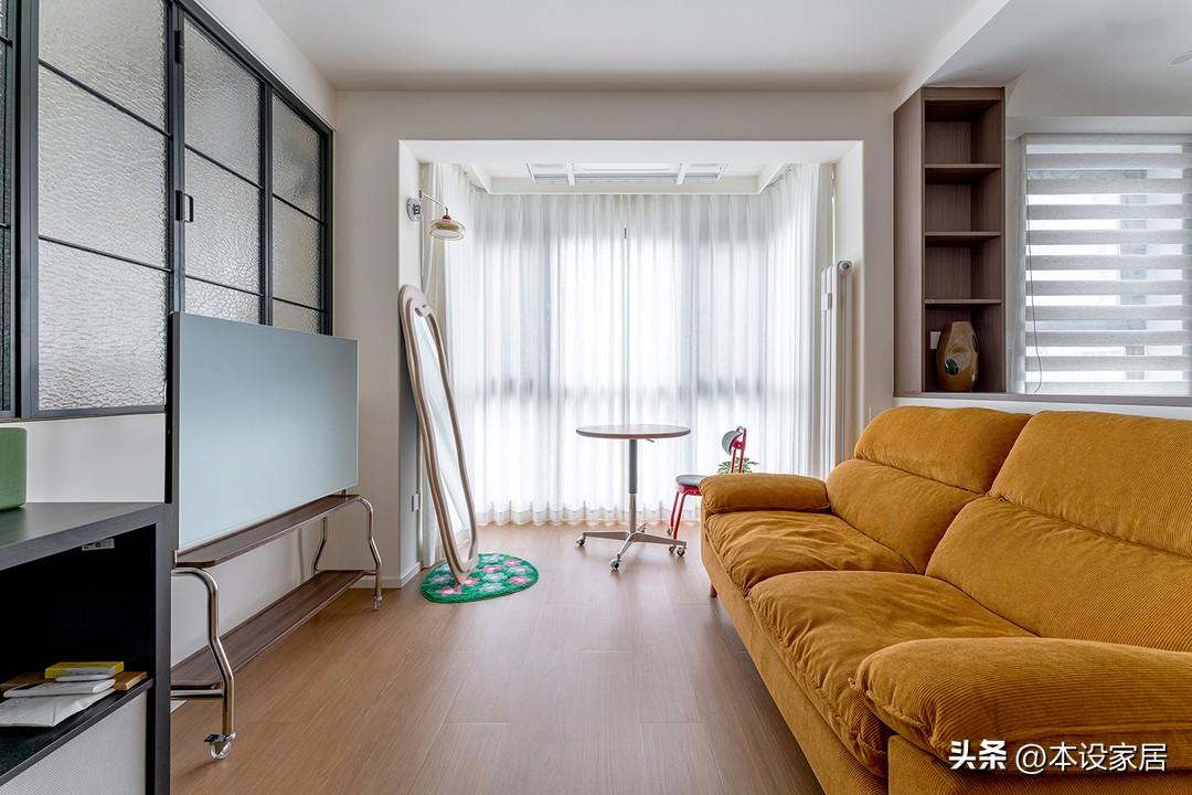 此外,拆除了原有客廳與廚房的隔牆,客廳與臥室之間採用玻璃隔斷,增加採光的同時,視覺也更加通透。