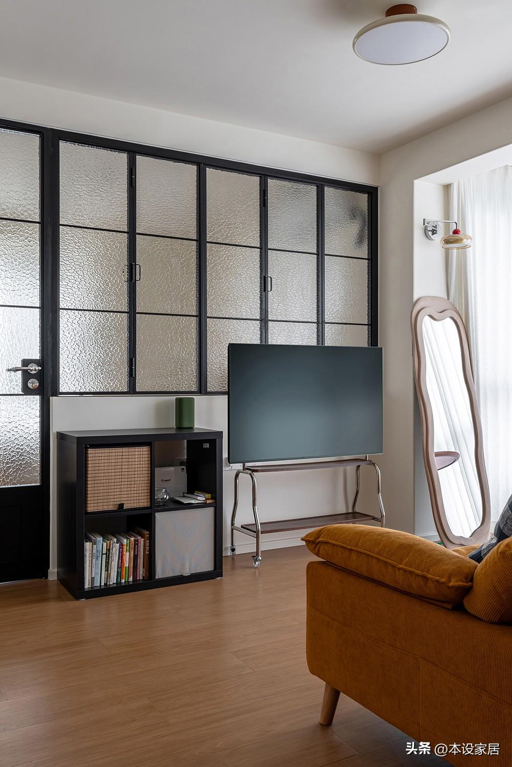 客廳與臥室之間使用黑鋼玻璃做隔斷,劃分不同功能空間的同時,視覺顯大又通透,對於小戶型來說值得借鑑。