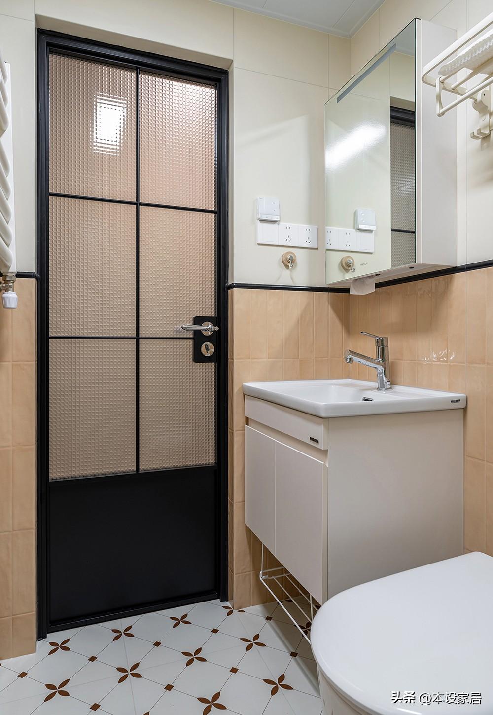 而地面的復古花磚,搭配牆面的淡綠色與奶油色的拼接牆磚,有一種奶茶配了層焦糖掛壁的既視感,色調暖乎乎的,又呈現出淡淡的復古懷舊感,耐看極了。