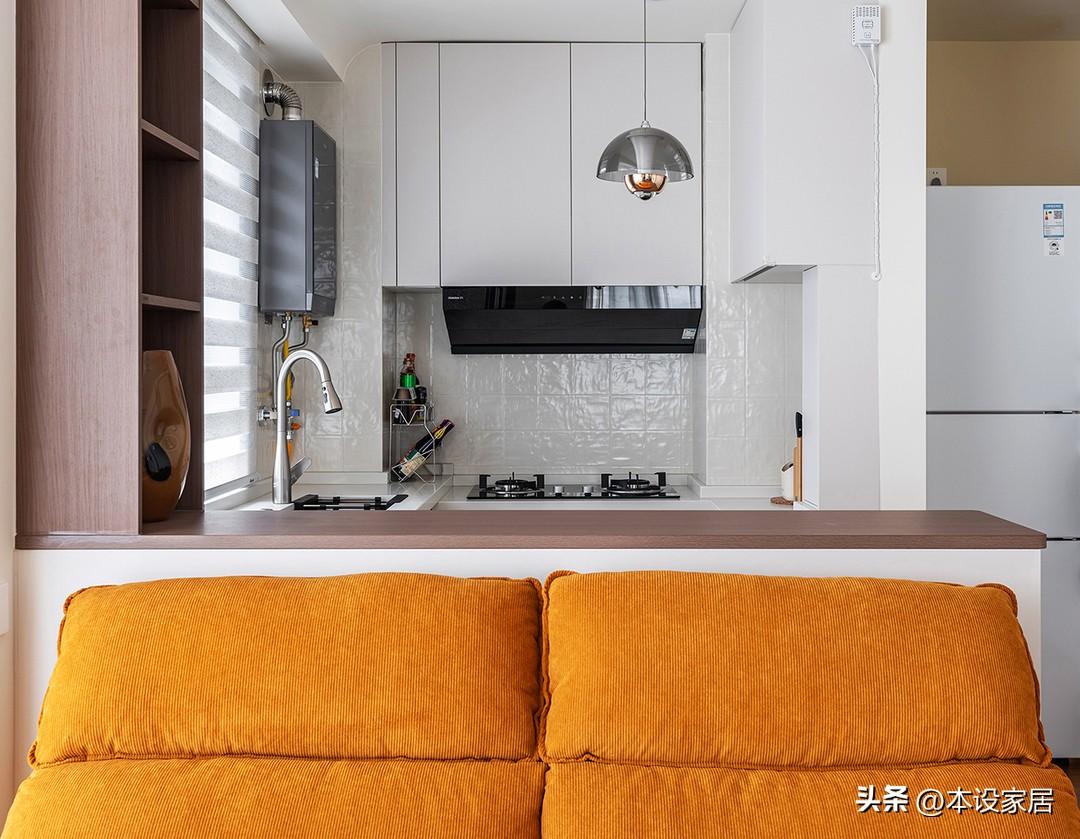 廚房與客廳之間做半牆,這樣喫飯、下廚都可以看電視,親友來訪也可以隨時互動,而整體的淺色基調,通過暖白、米白和木色的搭配,給人明亮溫馨的視覺體驗,完美地解決了小戶型產生的擁擠和侷促感。