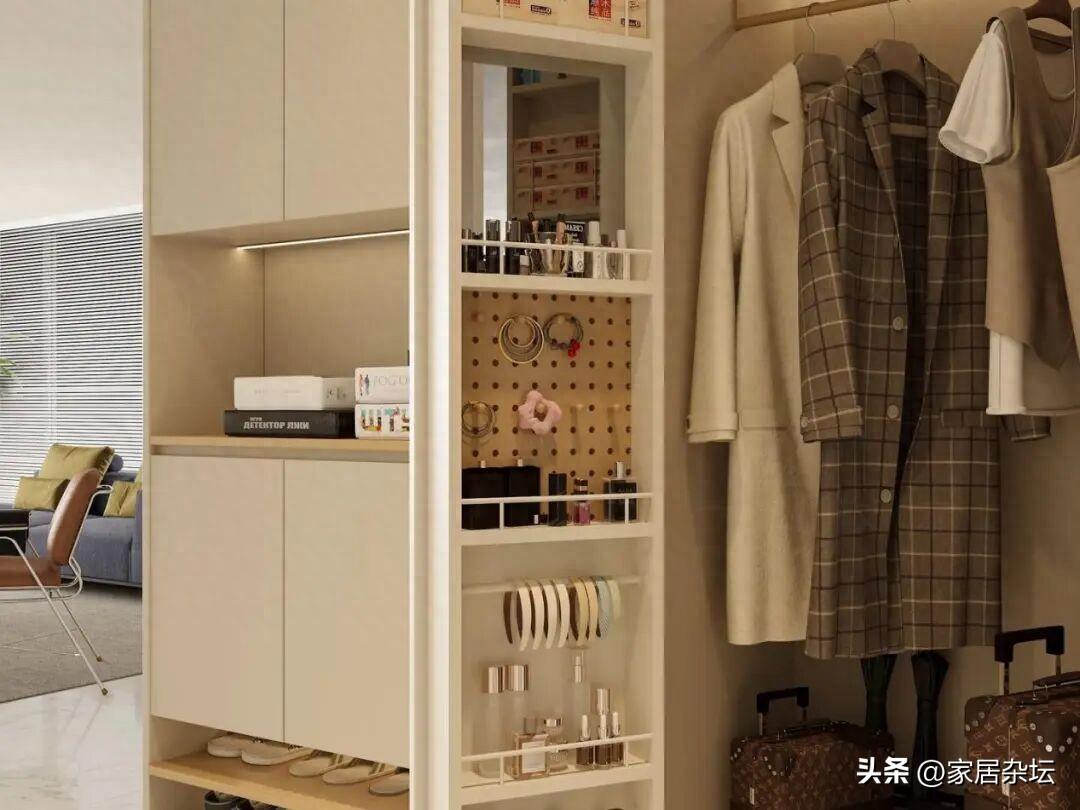 如果大家不知道怎麼做,可以在定製衣櫃的時候,側面設計一個15~20釐米深的薄櫃。裏面可以放置活動的層板,或者是抽拉配件。