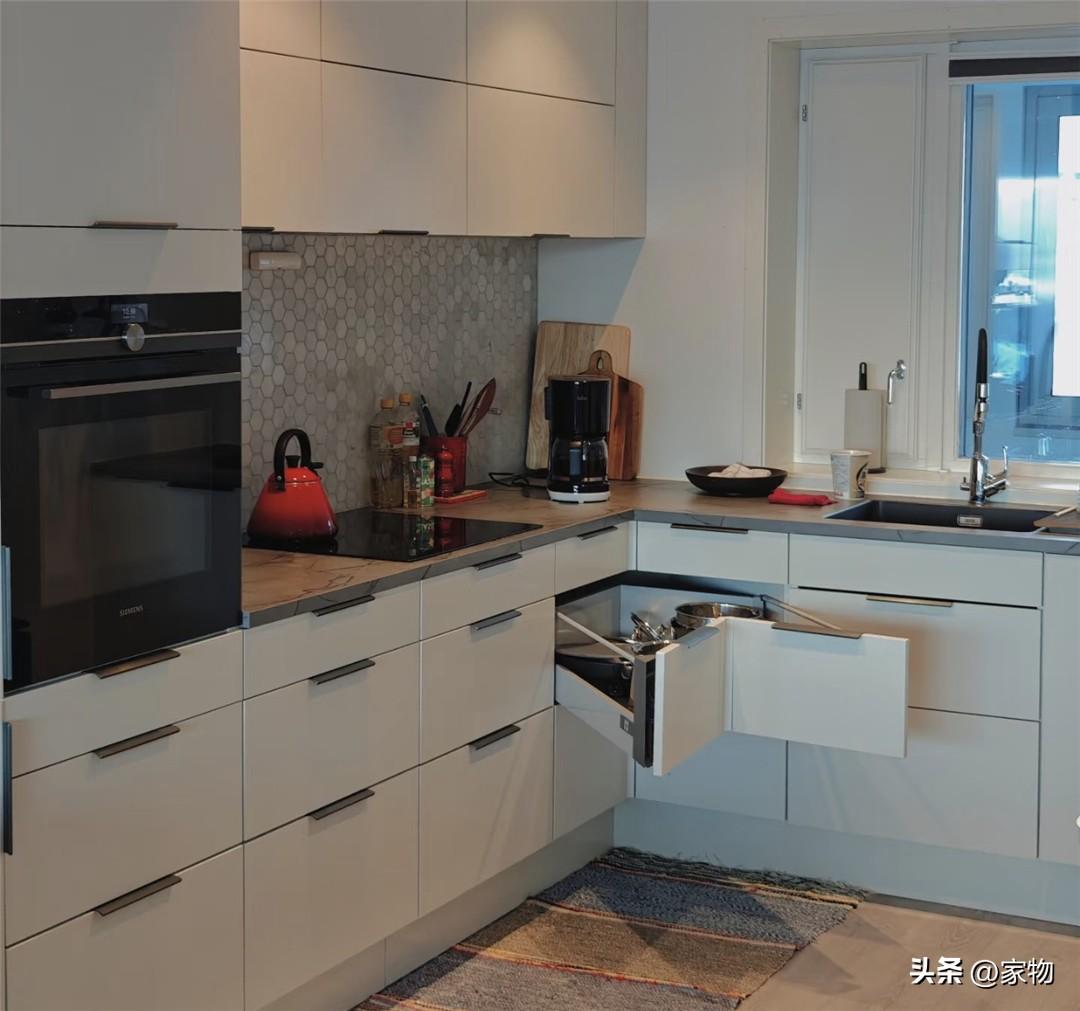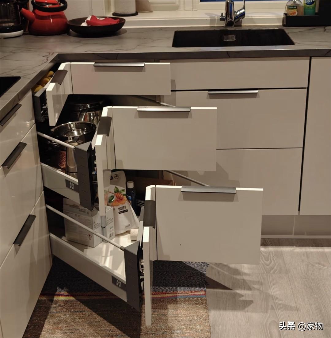 看到這種L形櫥櫃,最爲頭疼的就是轉角的位置,這些地方往往太容易浪費,即便是塞滿東西,到最後也是個拿取不便,放在裏面的東西要麼過期要麼遺忘,沒法真正應用起來,實在是有些浪費。