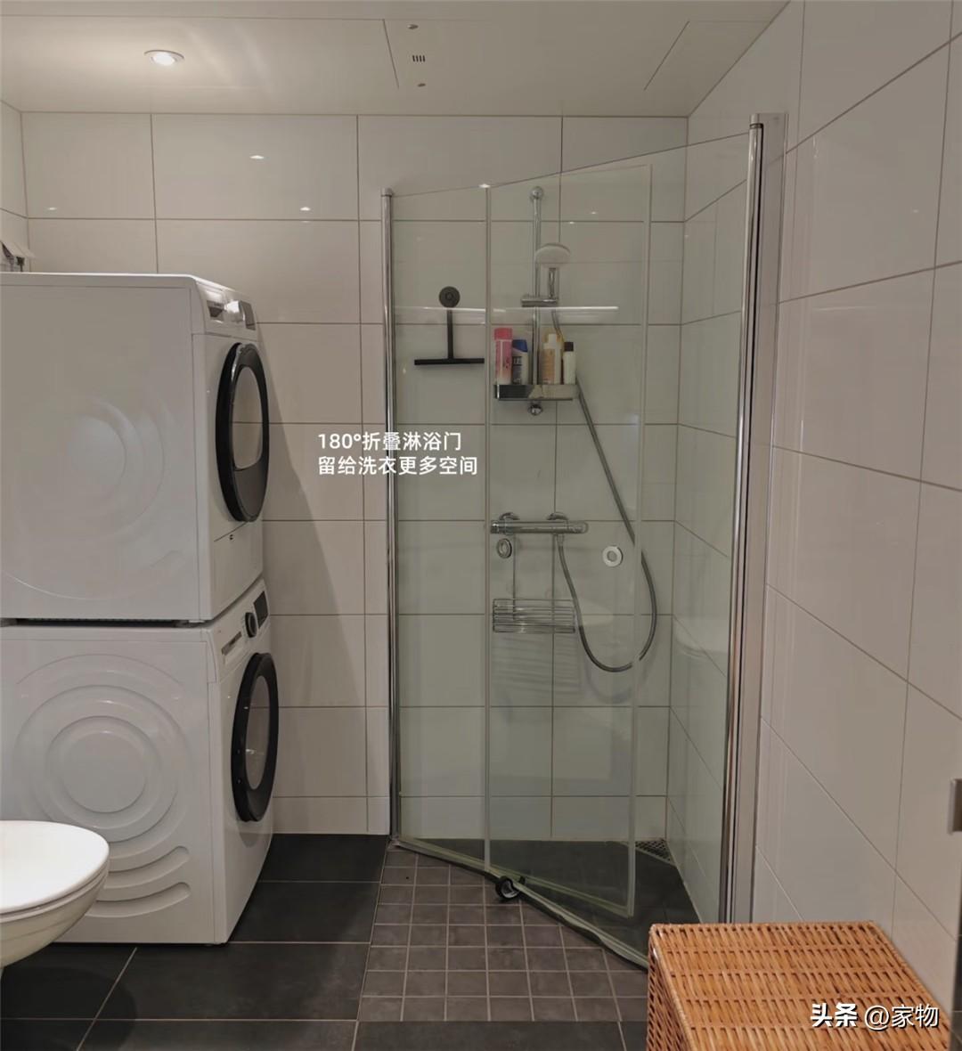 我真是忍不住先說說這個衛生間中的浴室,這間浴室與很多人家中的不同,在左右兩側安裝了兩扇可以完全摺疊的門扇,正常洗澡的時候可以變成正方形的浴室,而不用的時候則可以向內收縮變成三角形,給洗衣機和烘乾機讓出空間,實用性頗強。