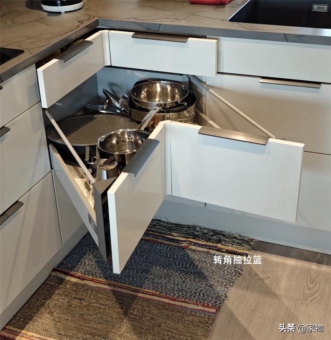 而且這三層拉籃,也是分爲大中小三個尺寸的,從中間一層便可以放下一些小奶鍋或者其他大盆餐具,關上櫃門後一點也看不出來,說起來,這也算是將轉角空間盡數利用了起來,半平米不曾浪費。