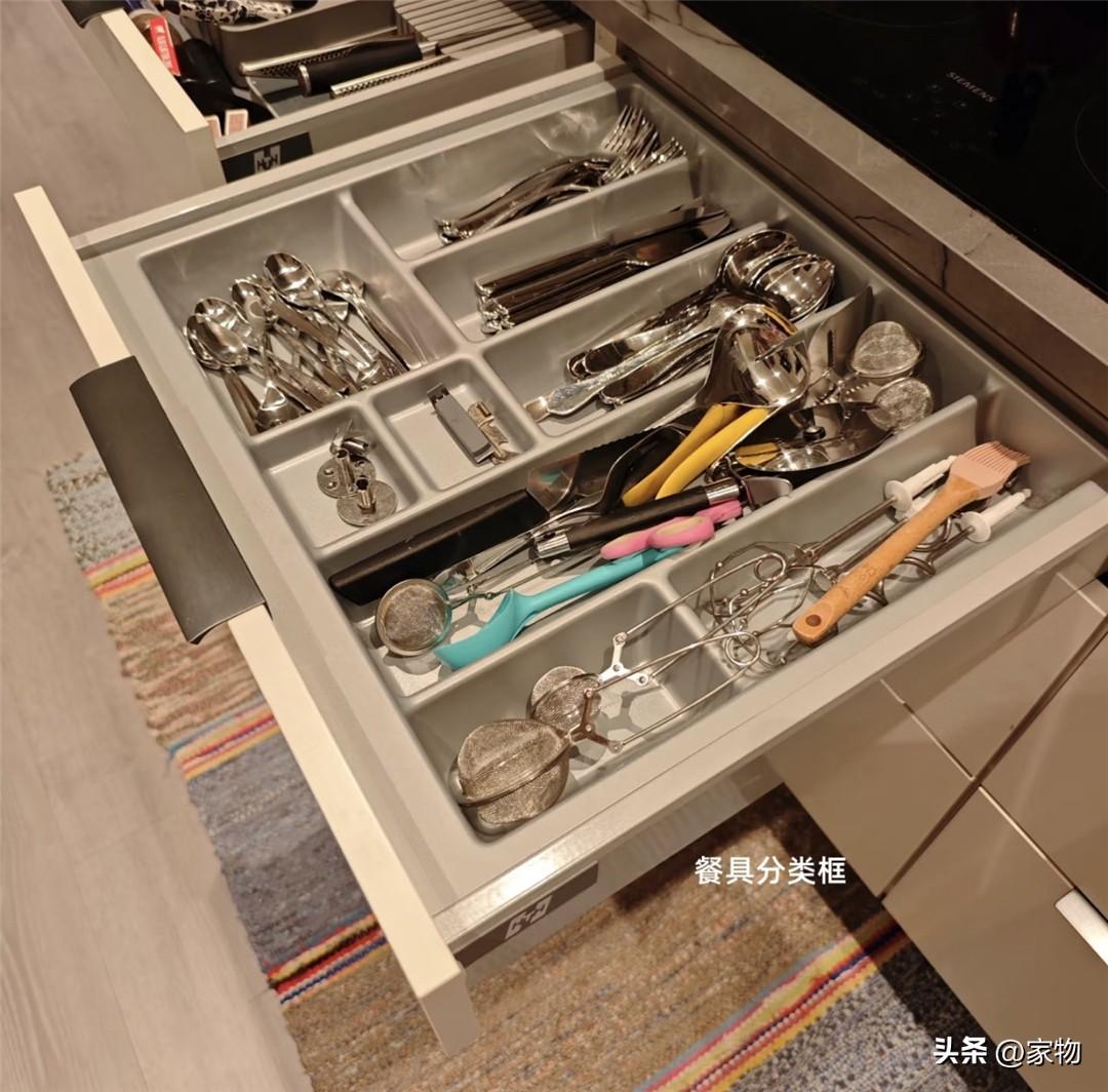 哦對,還有這櫥櫃的第一層小抽屜,雖然很薄,但完全可以做成專門收納餐具的抽屜,裏面直接做分類格,有大有小,分別收納勺叉刀筷(好像沒筷子)等各種餐具,無論是拿取還是放入其中都一目瞭然。