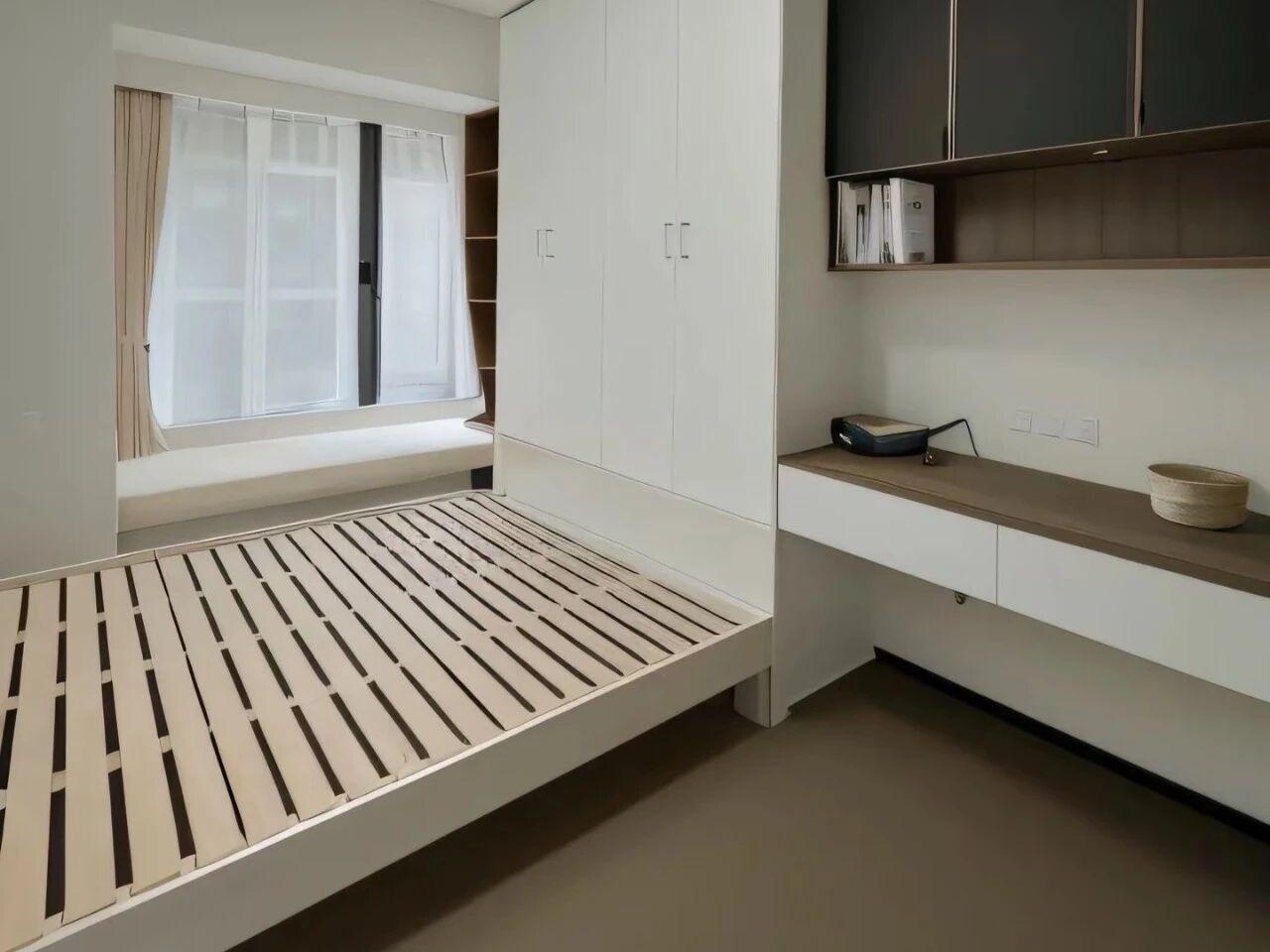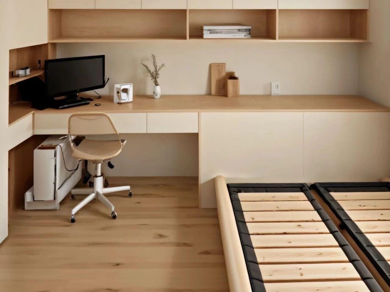 在書房或者是次臥設計地臺式榻榻米。榻榻米的牀板是採用的透氣式,再結合儲物櫃、書桌、衣櫃等功能,可以打造出集睡眠、辦公收納於一體的多功能房間。