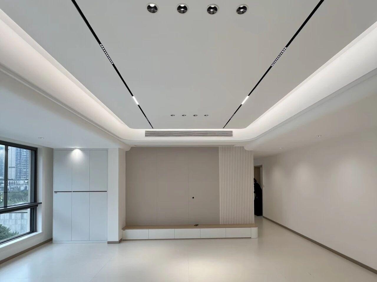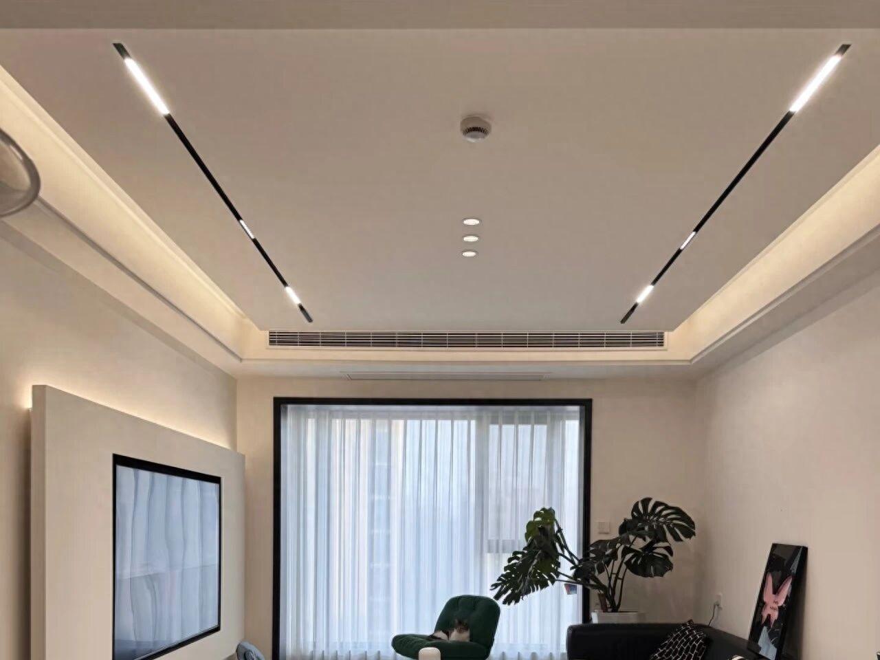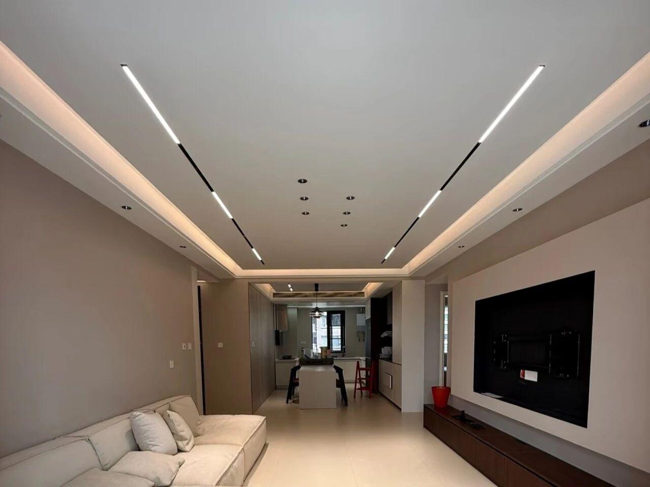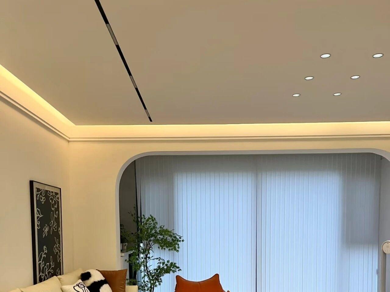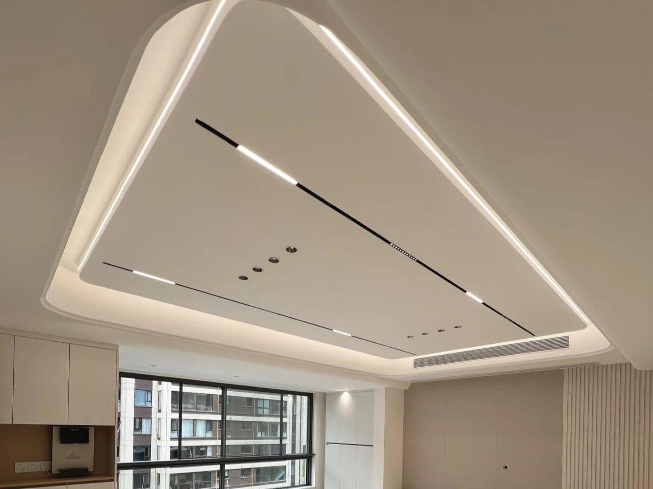 而目前比較流行的就是懸浮吊頂,再配上無主燈設計。像有的配的是磁吸的軌道燈、筒燈、射燈等,能夠實現多層次照明。