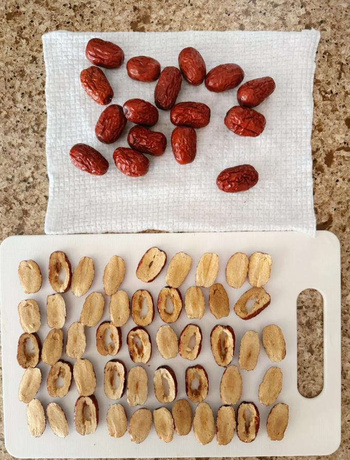 1.紅棗洗乾淨、晾乾,切片、去核;