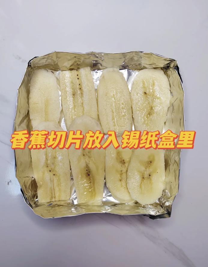 1.香蕉切片,擺放在錫紙盒裏;