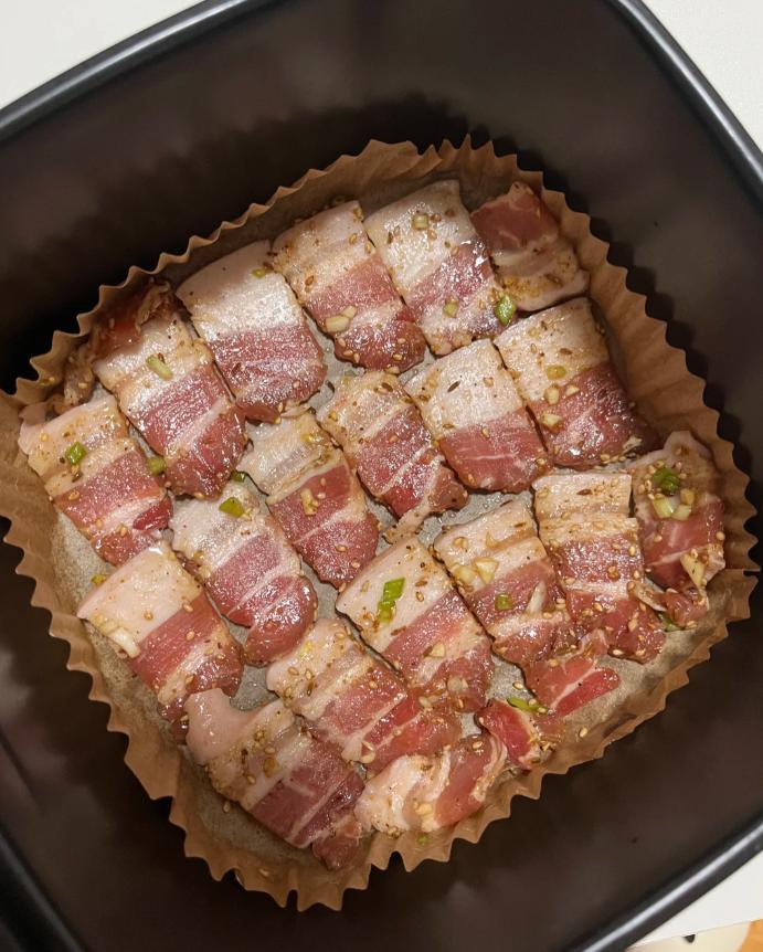 2.取出空氣炸鍋,鋪上油紙,把醃製好的五花肉依次排列在上面,設置180℃+8分鐘;