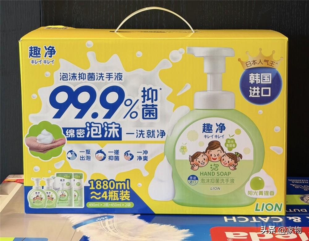 專門給小孩子買的洗手液,有兩個瓶子分別放在主衛和客衛,盒子裏還有替換裝,一盒用一年真的不誇張。