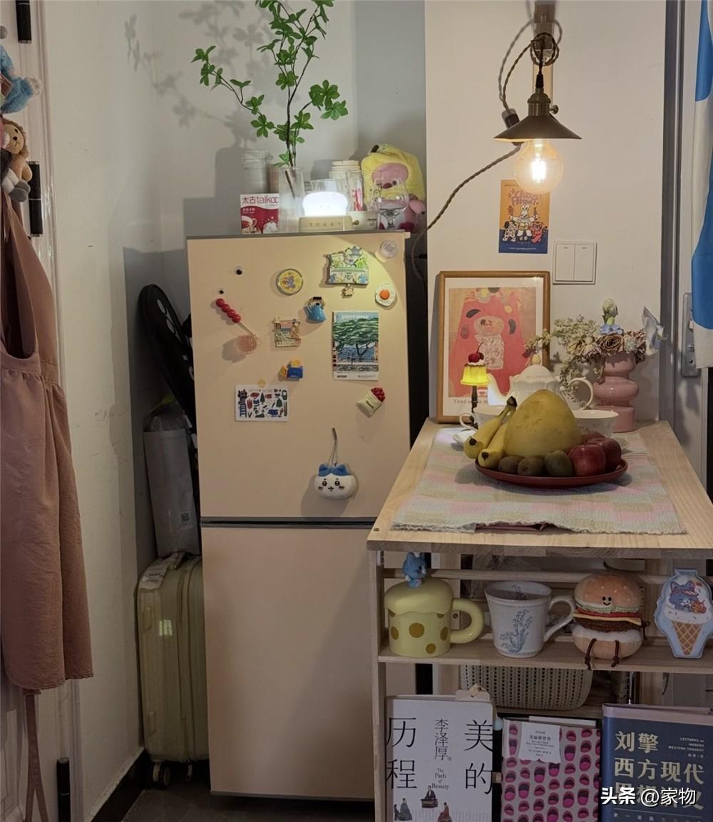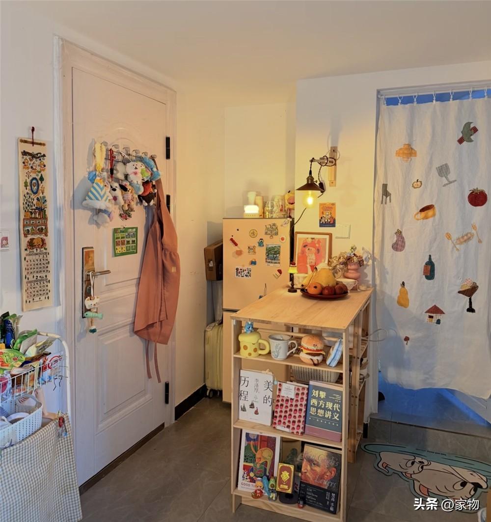 不僅如此,她還將冰箱放在了門口原本爲鞋櫃預留的凹格內,這裏離廚房也不遠(當然本來家裏也沒多大),做菜烹飪的時候可以很方便的拿到食材,回家拿個飲料之類的也同樣方便。
