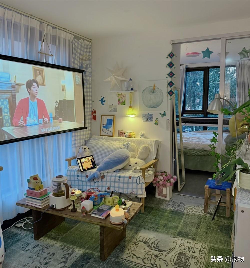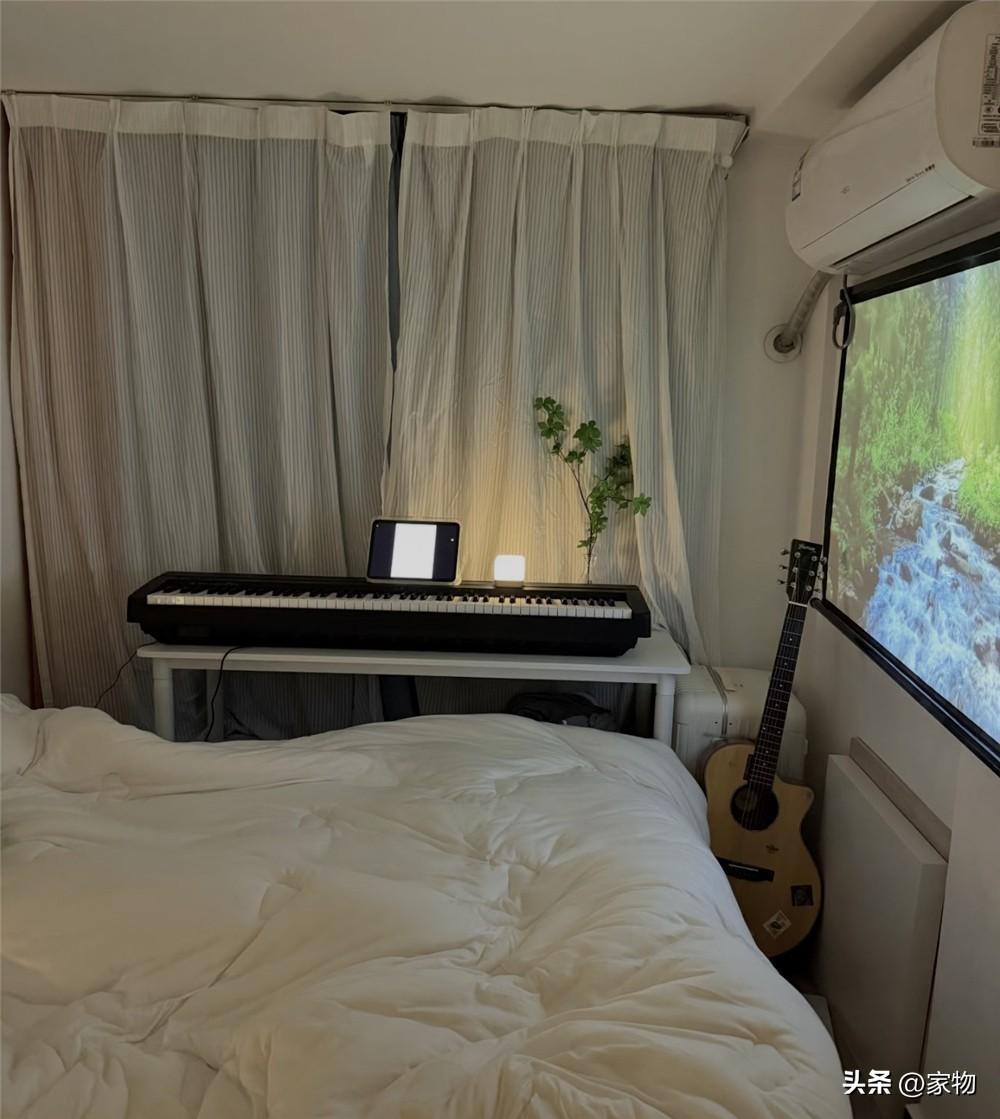 而牆面上同樣有一面簡簡單單的投影幕布,晚上的時候可以躺在牀上看看劇,或者打打遊戲,一個人的日子也過得有滋有味。