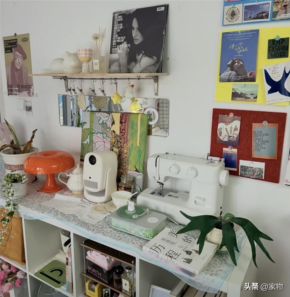 就比如上面的掛架,可以放置畫報擺件,並搭配掛鉤來進行收納;又比如旁邊牆上的毛氈墊,可以用圖釘釘一些大頭貼或備忘錄,同樣是一面可愛的裝飾牆。