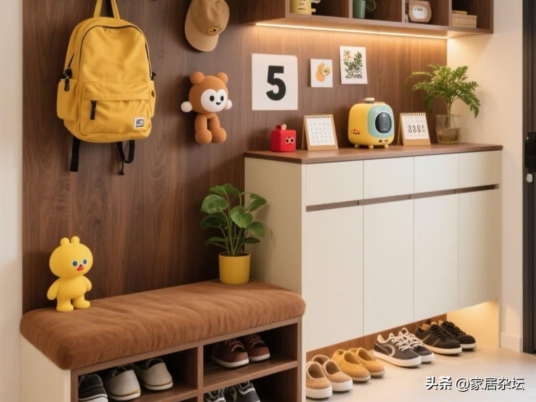 玄關裝修,首先考慮的玄關櫃。玄關櫃底部可以留空18釐米,用來放日常鞋。此外,要設置感應燈,晚上回來不用摸黑。