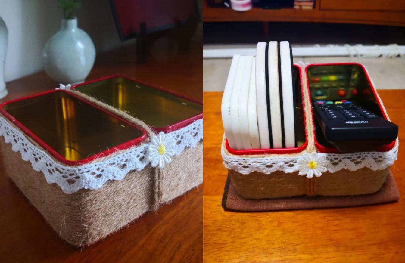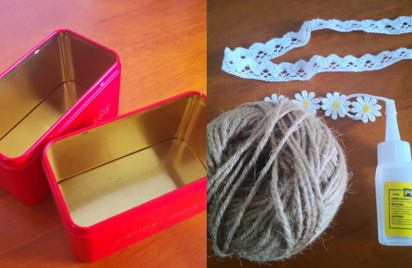 其實做起來很簡單,材料也不難找,弄點麻繩、花邊和膠水(有熱熔膠也行)就可以了,直接把麻繩纏繞到茶葉盒上,這樣一個好看的收納盒就搞定了。
