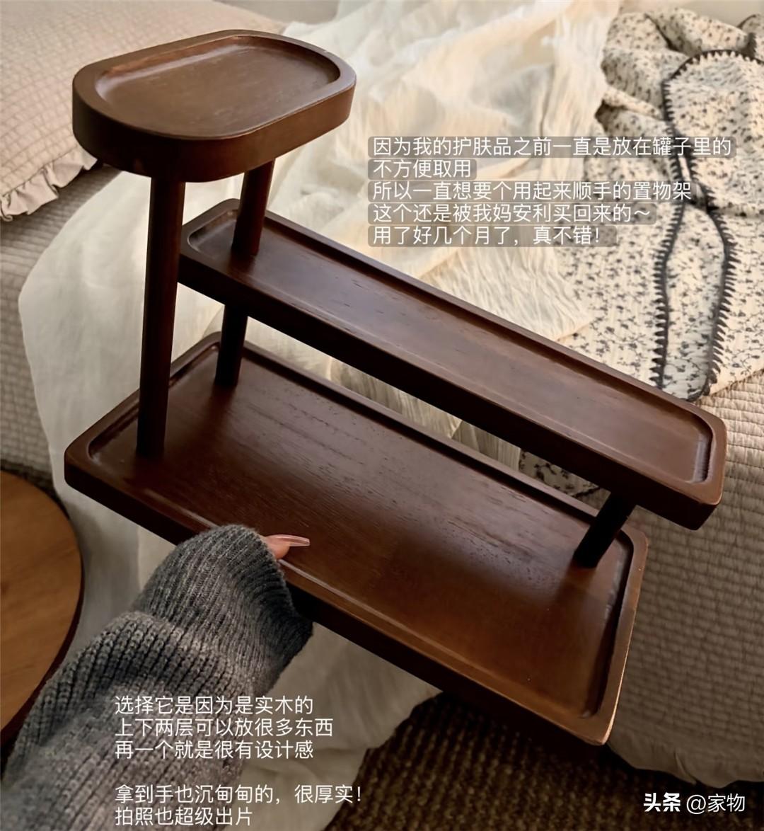 看上去是三層,實際上是一大一小兩層加上一個頂拖的架子,我發現它最適合的場景有兩處,一是放在玄關,收納鑰匙錢包等各種隨身用品,二是放在梳妝檯上,收納護膚品和小件首飾,又能利用縱向空間又好看。