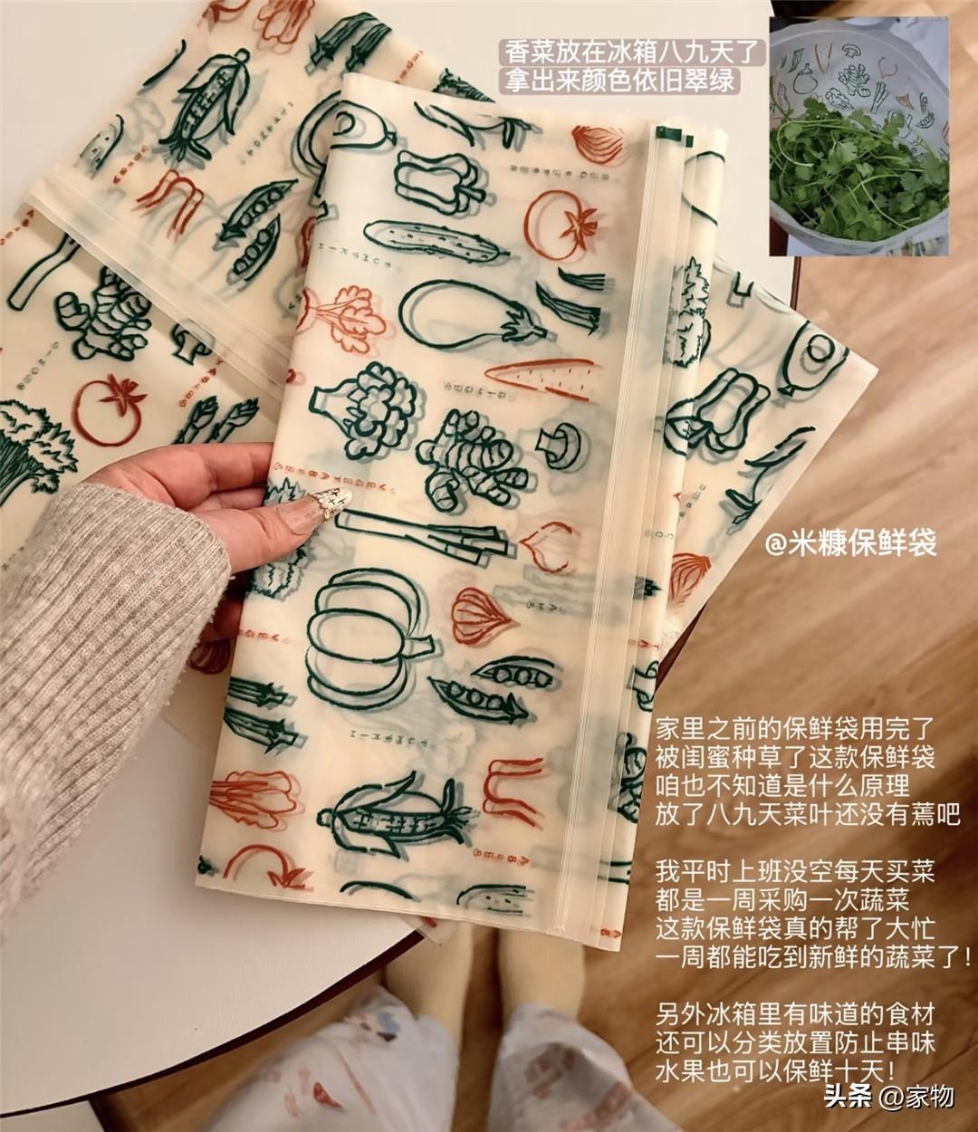 說是用米糠做的保鮮袋,我也不知道到底是什麼個原理,看它不貴還好看就買了,沒想到保鮮效果真的讓我眼前一亮,尤其是放些葉菜,扔到冰箱裏哪怕一週都不會打蔫,真的是我用到過最好用的保鮮袋之一。