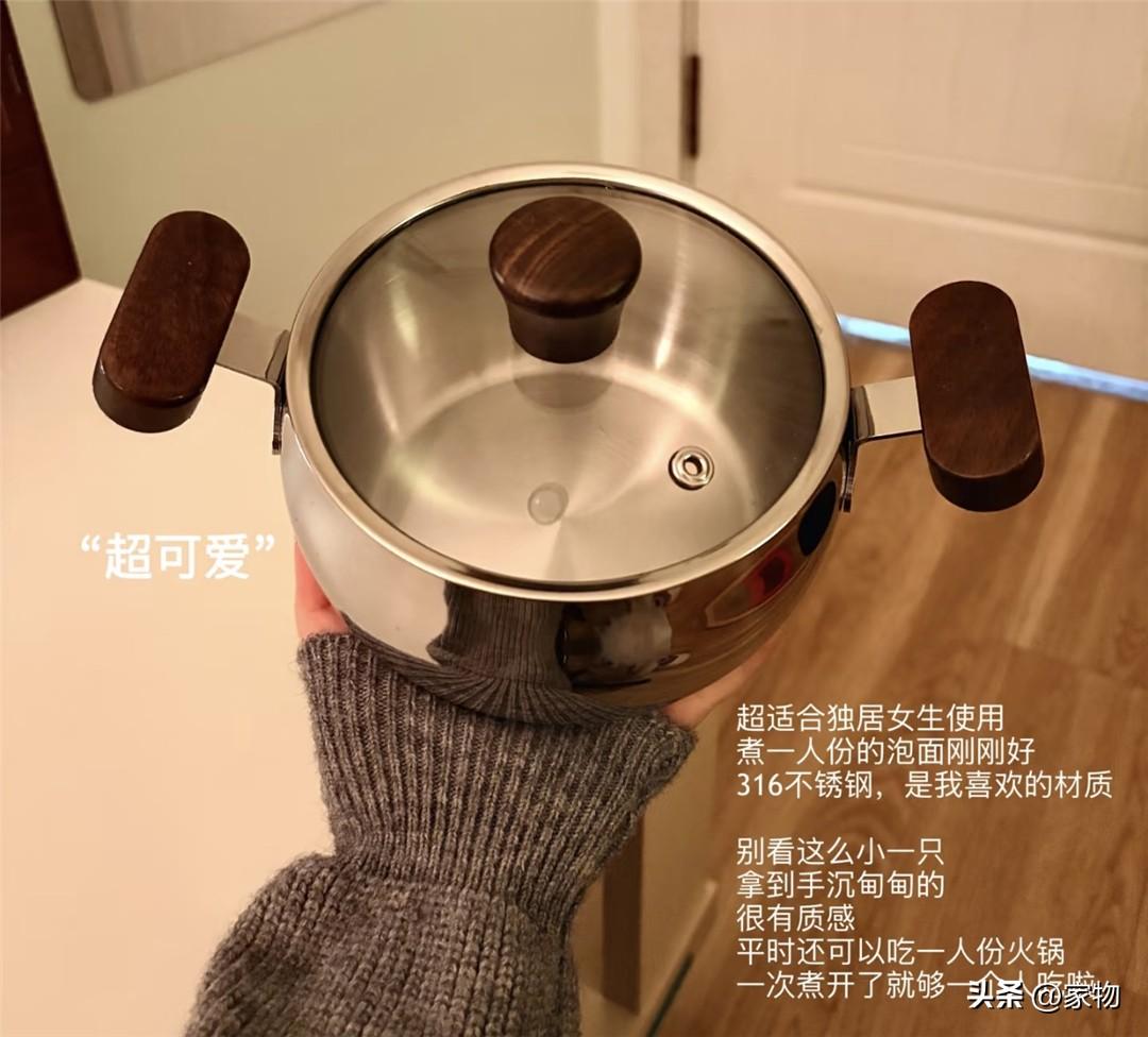 一個超小號的雙耳鍋,看起來就圓滾滾的很可愛,材質是316不鏽鋼,耐用又安全,因爲鍋壁較厚,小小一個還是挺有分量的,平時用它煮個泡麪、一人食的壽喜鍋,都非常不錯,個人還是比較推薦的。