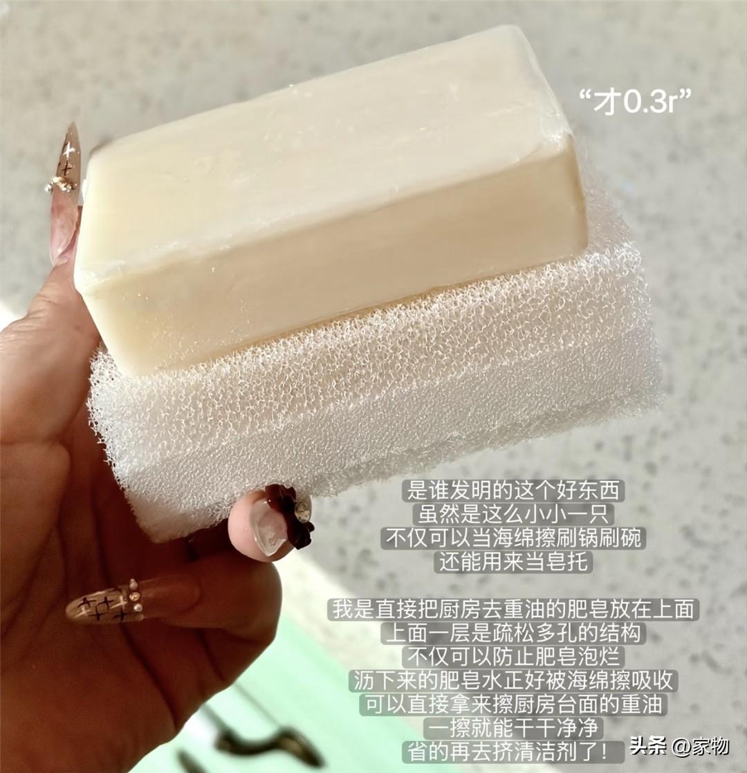 也不知道是誰琢磨出來的東西,本身就是個海綿洗碗刷,但上半部分孔隙較大,可以起到瀝水的效果,放在臺面上,直接把肥皂香皂放上去就可以吸附水分,起到瀝乾效果。