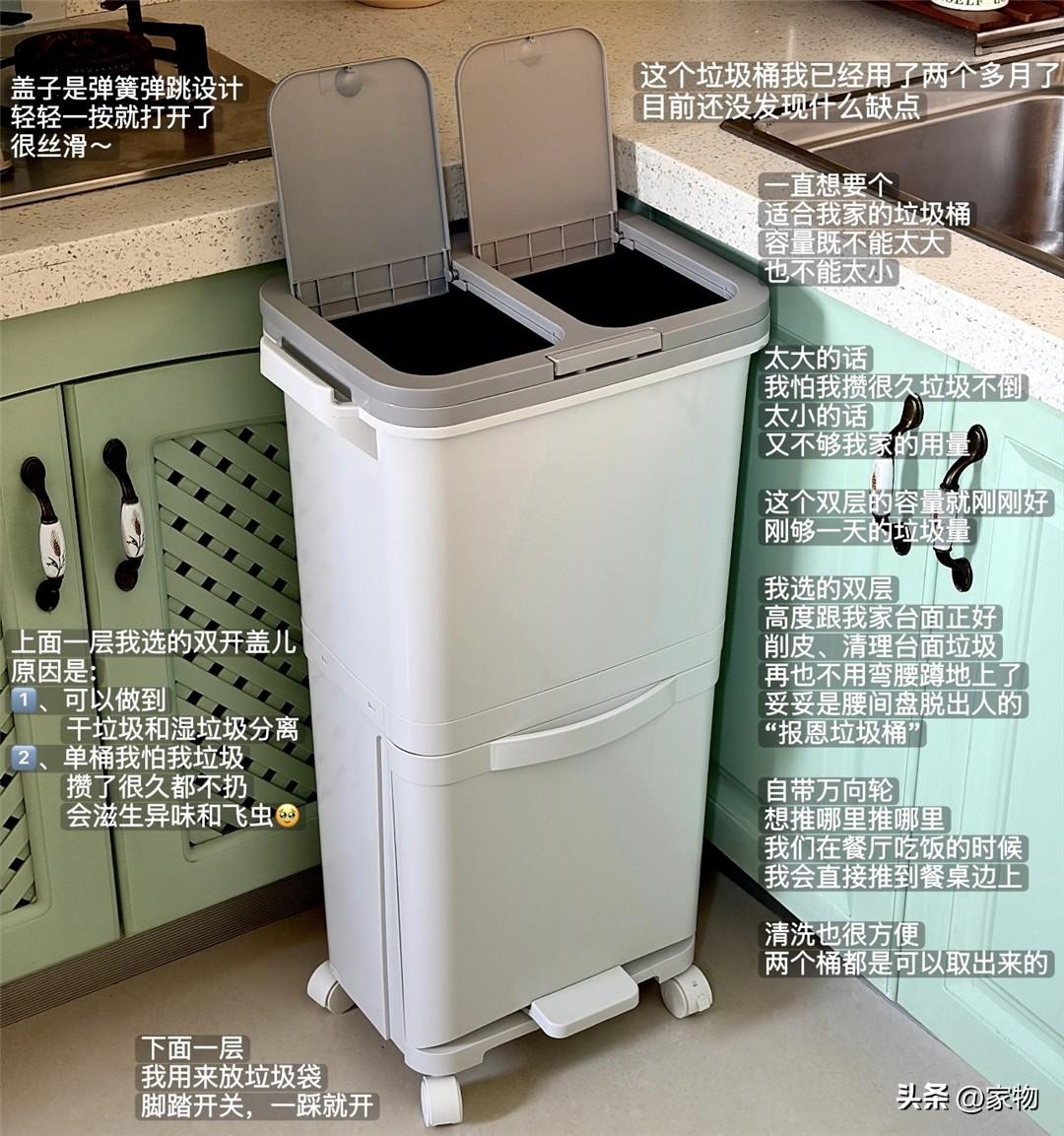 我發現了廚房最佳垃圾桶,就是它,雙蓋分區的大號垃圾桶,它高度合適,不用彎腰就能扔垃圾,而且左右兩側還設有乾溼兩個垃圾簍,可以分別將幹垃圾和廚餘垃圾放進去,避免產生異味。