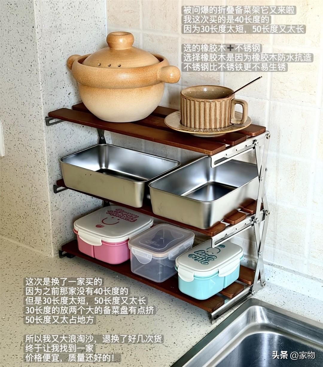 三層的摺疊式收納架,放在水槽旁邊收納,或者當做餐邊櫃、餐桌上的餐具杯具收納架簡直完美,本身就體積小巧不怎麼佔地,不用的時候還可以完全摺疊起來,隨便找個抽屜或縫隙塞進去,不鏽鋼+木板的材質又很好看,無敵。