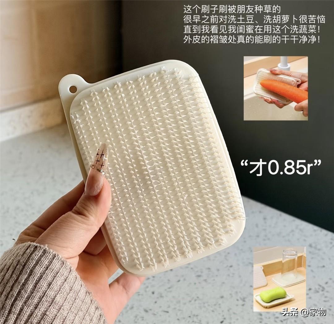 洗土豆洗胡蘿蔔這類泥土較多的蔬菜,我現在都會用這種清潔刷,它的上面有短小但細密的刷毛,攥在手上,稍微用力,就能把蔬菜表面刷得乾乾淨淨,就連縫隙裏的泥土也能去除掉,好用的很。