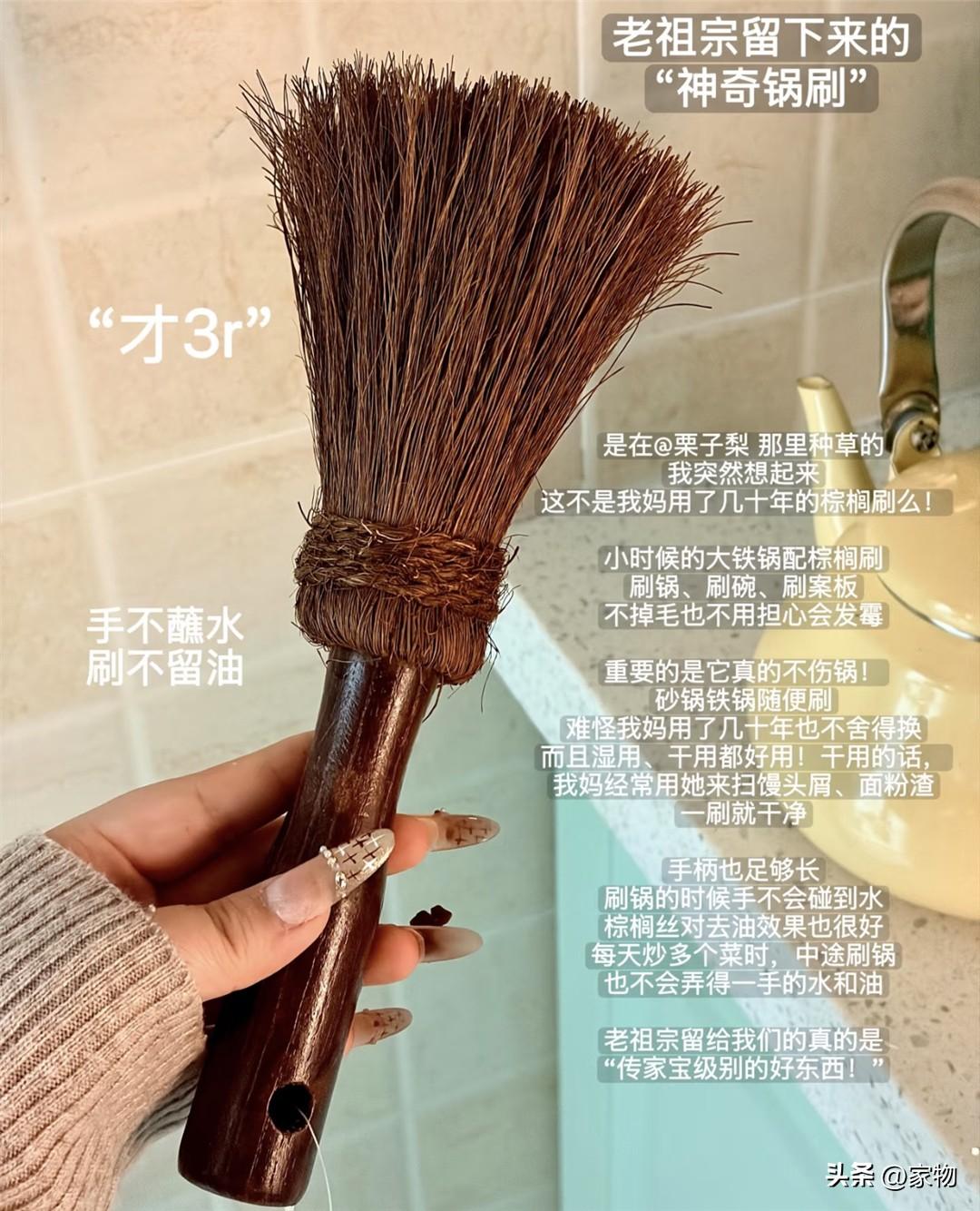 小時候就用過的老式鍋刷,刷頭應該是棕櫚毛的材質,廚房裏一切沾染了油污的餐具廚具,都可以用它刷洗,尤其是我家那口大鐵鍋,既能刷掉油污鏽漬,又不會傷及鍋體,果然有些東西,真的是老式的更好用啊。