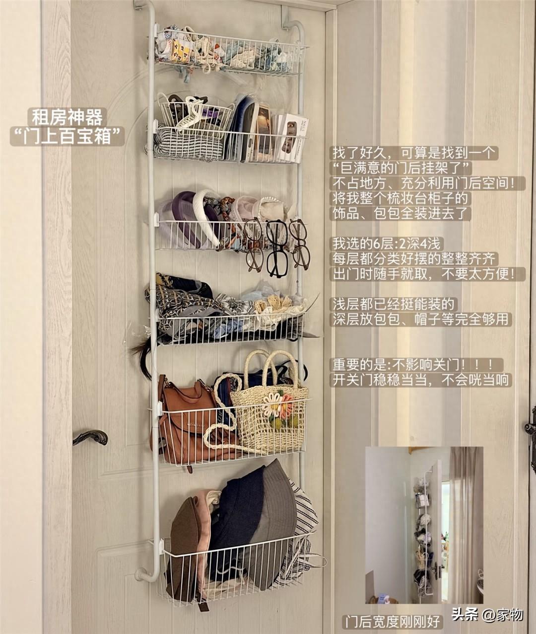 家裏空間小的話,自然要將能利用的每一寸空間儘量利用起來,就拿門後來舉例,其實安裝一組多層掛架,當做收納籃收納髮卡、帽子、包包等小件衣物或用品都非常合適,能充分利用縱向空間,減輕家中收納負擔。