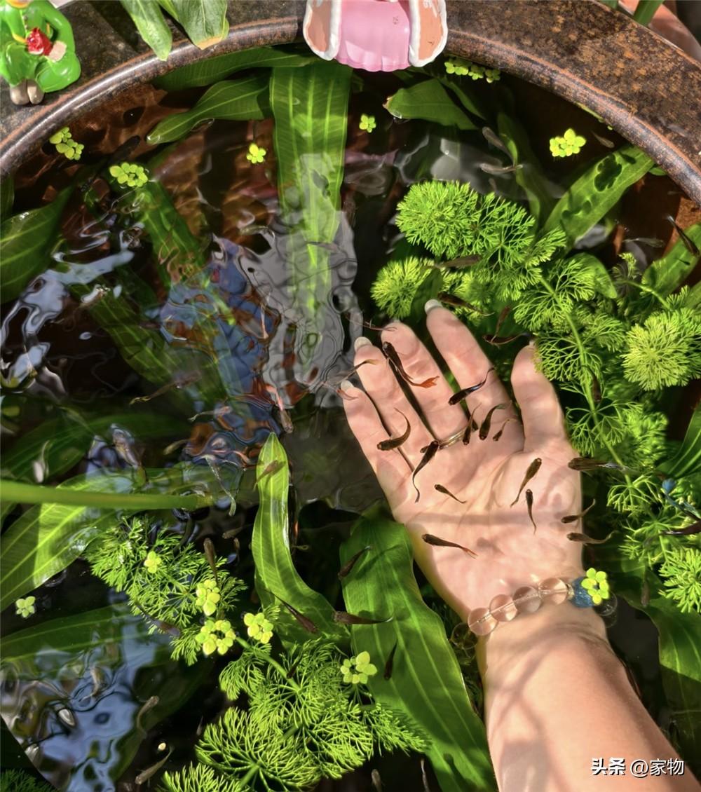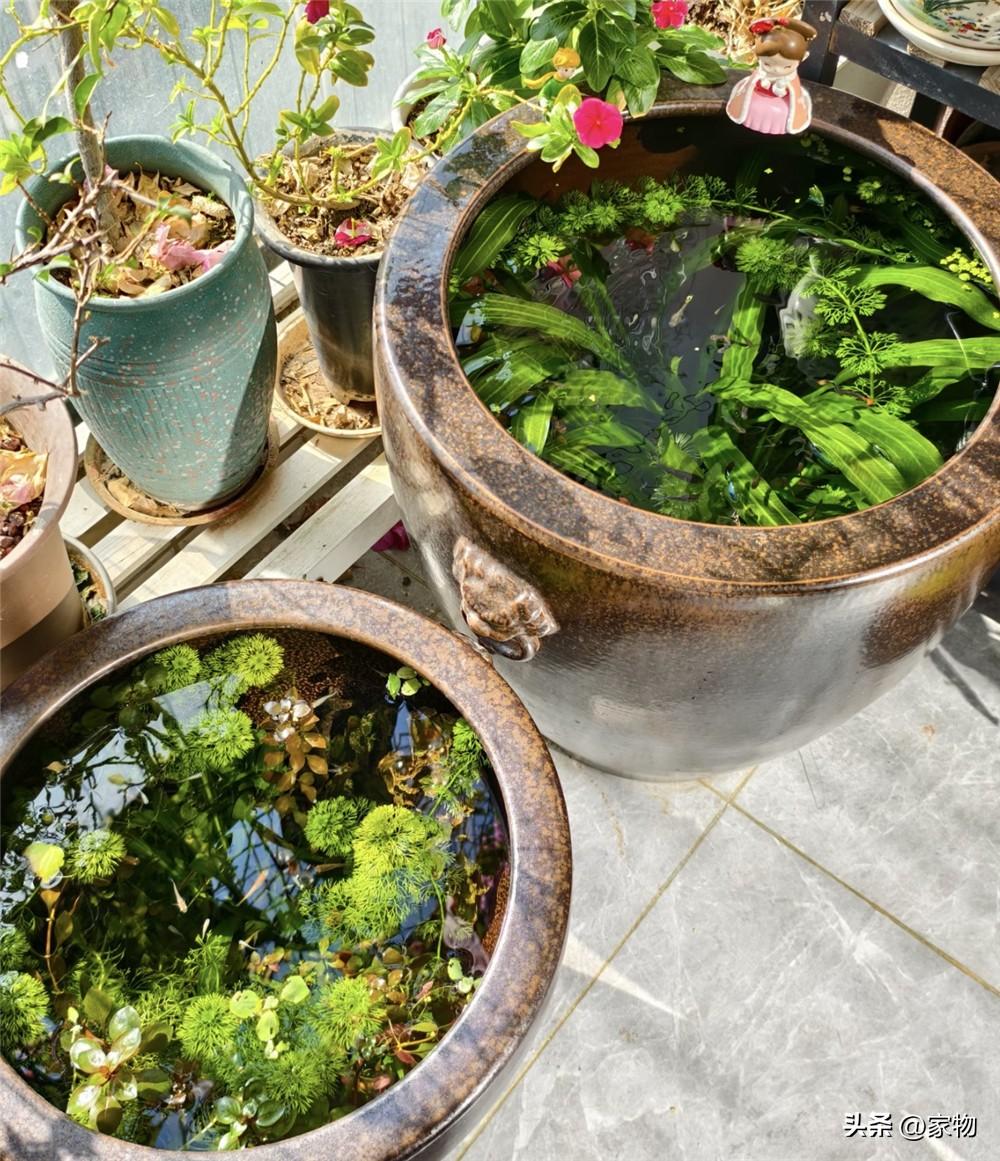 前幾年比較火的“生態缸”,也被這位主婦太太搬回了家,一大一小兩個圓形水缸,裏面養了很多水草和小魚苗,比起在封閉陽臺養魚來說,陽光和空氣流動都要更充足,水草和小魚也能自然生長。