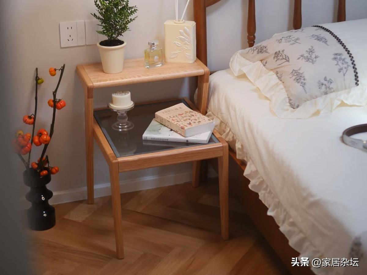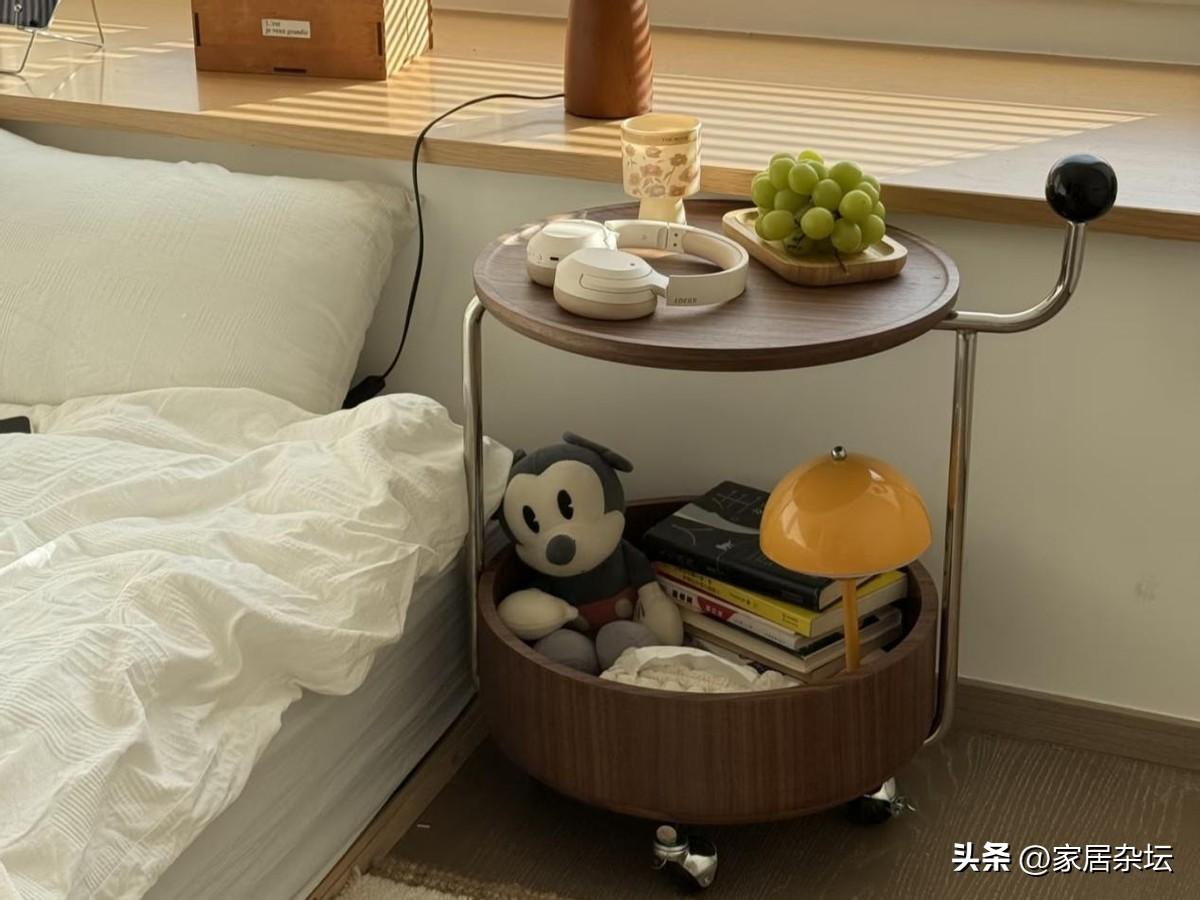 不買傳統牀頭櫃,建議大家一側可以選擇帶儲物的邊幾,另外一側可以用輕便的小推車或者隔板,形成不對稱的美感。