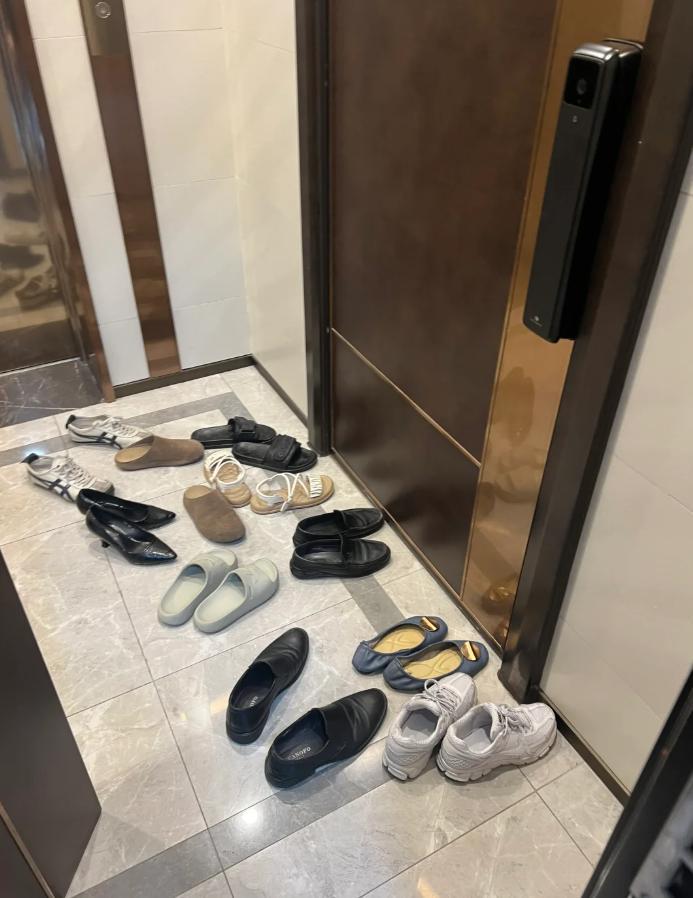 這種鄰居,說直白點就是沒有公德心,嫌棄自己的鞋子髒,或者臭,不願意放在家裏,就放在外面。就不怕燻到別人嗎?