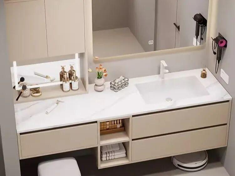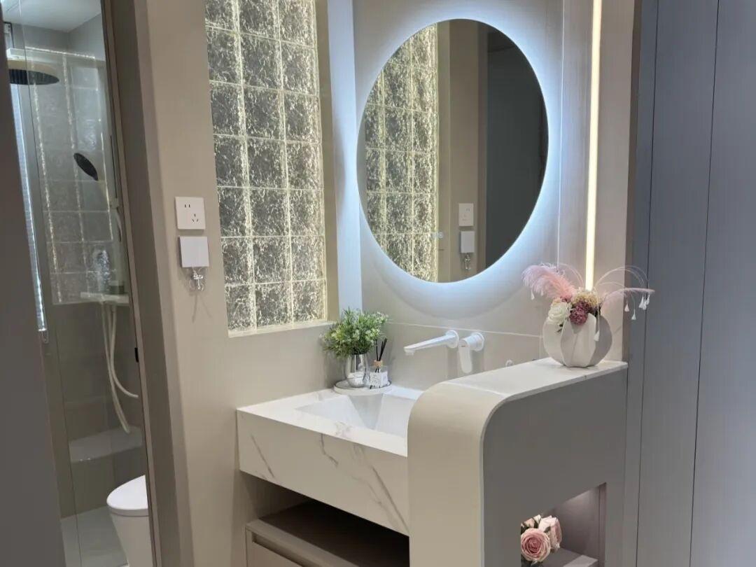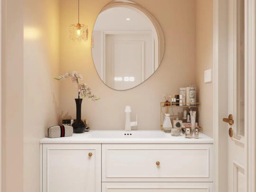 其中有一些細節也可以注意,如果是雙臺盆,可以選一大一小。梳妝段可以設置內嵌led化妝鏡;檯面下面也可以設置抽屜,存化妝品,護膚品,首飾、吹風區。