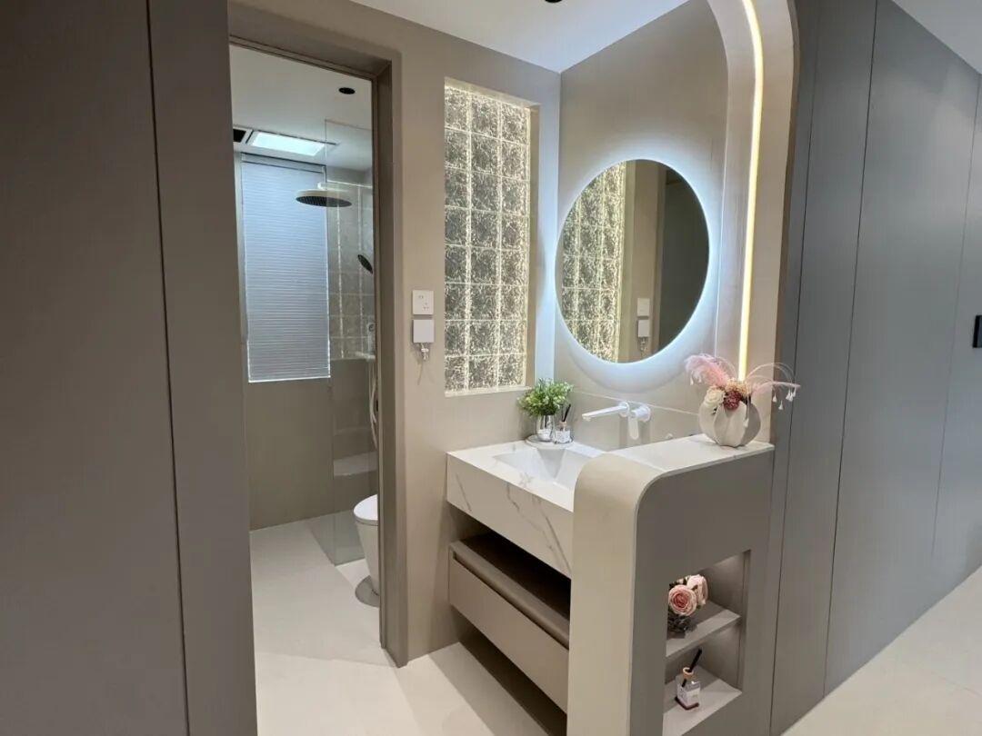 臥室洗漱化妝一體,實現了起牀洗漱,護膚,化妝,更衣一氣呵成,節省時間。而且一人洗漱,不影響另一人睡眠,對作息不同的家庭特別有利。