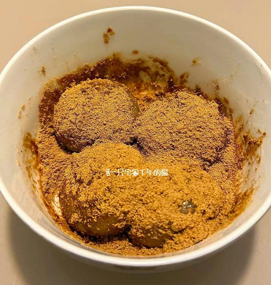 只需要把煮熟的湯圓,在熟黃豆磨成的粉裏滾一下,就能輕鬆搞定!像極了街上賣的有餡的餈粑和驢打滾。